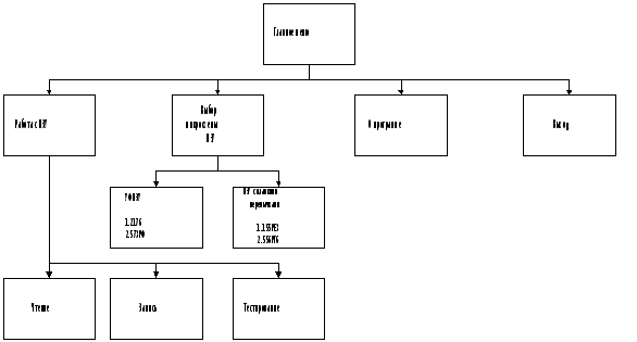 2.2.20. Процедура HexL2Str - представление символа в ввиде шестнадцатиричного кода. 2.2.21. Процедура HexB2Str - представление символа в ввиде восьмеричного кода. 2.2.22. Процедура MemEd - редактор текста. 2.2.23. Процедура Ffile - работа с файлами, запись, создание и чтение. 2.2.24. Процедура ReadROM - работа с программатором, чтение и запись данных ПЗУ, тестировнаие устройства. 2.3. Разработка программного интерфейсаПрограммный интерфейс был разработан с учетом всех его эксплуатационных характеристик. Он должен отвечать следующим требованиям: полнота и краткость отображаемой информации; удобное расположение информации на экране; оперативность работы. Интерфейс программного обеспечения был построен по иерархической структуре.