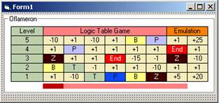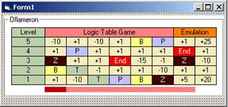 счету игрока. Нижний цветной линейный индикатор Счет игры ведется в оранжевой ячейке Игра ведется до тех пор, пока счет игрока не станет равным нулю или маркер не попадет на ячейку с номиналом |End|. Игра совсем не так проста, как может показаться. Совсем легко разместить свой маркер так, что на него сместится ячейка с номиналом |Z| - обнуление счета, или |End| - окончание игры. Здесь описывается процесс программирования «текстовой версии» логической табличной игры «Oflameron». Номиналы ячеек представлены на экране в символьном виде, а ячейки представляют собой элементы Label. В следующей части документа будет представлено полное описание процесса разработки графической версии игры и версии игры для карманных компьтеров (PDA). Программирование Заполним ячейки игрового (массив field(8, 6))поля значениями от генератора случайных чисел. Вычислим количество секунд в текущем времени и столько раз «прокрутим» цикл с обращением к генератору случайных чисел: TM = Time 'Получить время в переменную TTMS = Len(TM) 'Определить длину строки с значением времени TTM = Mid$(TM, 7, 2) 'Выделить из строки количество секунд For i = 0 To TTM ‘Цикл с числом повторений, равным количеству секунд Form1.Caption = Int((20 * Rnd) + 1) ‘Значения запишем в заголовок формы, чтобы ‘посмотреть, что работает Next i Заполним массив field(8, 5). Полностью процедура будет: Private Sub Set_Nominal() TM = Time 'Получить время в переменную TTMS = Len(TM) 'Определить длину строки с значением времени TTM = Mid$(TM, 7, 2) 'Выделить из строки количество секунд For i = 0 To TTM Form1.Caption = Int((20 * Rnd) + 1) Next i '-------------------------------------------------- ' Заполним массив field(8, 5) For i = 0 To 7 For j = 0 To 4 field(i, j) = Int((20 * Rnd) + 1) Next j Next i End Sub Теперь можно записать тестовую процедуру Private Sub Fdraw() для того, чтобы посмотреть, как заполняется массив field(8, 6) Процедура будет выглядеть следующим образом: Private Sub Fdraw() Label7.Caption = field(0, 0) Label8.Caption = field(1, 0) Label9.Caption = field(2, 0) Label10.Caption = field(3, 0) Label11.Caption = field(4, 0) Label12.Caption = field(5, 0) Label13.Caption = field(6, 0) Label14.Caption = field(7, 0) Label15.Caption = field(0, 1) Label16.Caption = field(1, 1) Label17.Caption = field(2, 1) Label18.Caption = field(3, 1) Label19.Caption = field(4, 1) Label20.Caption = field(5, 1) Label21.Caption = field(6, 1) Label22.Caption = field(7, 1) Label23.Caption = field(0, 2) Label24.Caption = field(1, 2) Label25.Caption = field(2, 2) Label26.Caption = field(3, 2) Label27.Caption = field(4, 2) Label28.Caption = field(5, 2) Label29.Caption = field(6, 2) Label30.Caption = field(7, 2) Label31.Caption = field(0, 3) Label32.Caption = field(1, 3) Label33.Caption = field(2, 3) Label34.Caption = field(3, 3) Label35.Caption = field(4, 3) Label36.Caption = field(5, 3) Label37.Caption = field(6, 3) Label38.Caption = field(7, 3) Label39.Caption = field(0, 4) Label40.Caption = field(1, 4) Label41.Caption = field(2, 4) Label42.Caption = field(3, 4) Label43.Caption = field(4, 4) Label44.Caption = field(5, 4) Label45.Caption = field(6, 4) Label46.Caption = field(7, 4) End Sub Т.е. здесь просто каждая ячейка записывается в Caption каждой ячейки. Такой метод не стоит считать оптимальным и в последующем можно использовать другие приемы программирования. Чтобы посмотреть резльтаты, нужно вставить вызов двух процедур Private Sub Set_Nominal() и Private Sub Fdraw() в автозапуск при старте программы (на время): Private Sub Form_Load() Set_Nominal Fdraw End Sub Полный проект на Visual Basic этого этапа разработки игры – в файле vbg1.zip Теперь нужно создать процедуру, в которой будет анализироваться содержимое ячеек массива field(8, 6) и в зависимости от их значений будет формироваться нужное символьное значение (номинал) ячейки игрового поля и задаваться нужный цвет символа и фона ячейки. Перепишем процедуру Fdraw() в другую процедуру. Создадим еще одну Label56 для временного хранения «сгенерированного» номинала ячейки и ее цветовых атрибутов (выделена на рисунке).