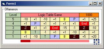 k = k + 1 Next i Next j End Sub Такой вариант заполнения игрового поля НАЧАЛЬНЫМИ значениями (при старте игры) нельзя считать оптимальным. Однако он очень нагляден для понимания алгоритма. Процедура Form_Load() теперь будет выглядеть так: Private Sub Form_Load() Set_Nominal Fdraw Field_Fill End Sub Для того, чтобы посмотреть, как все работает, добавим еще одну процедуру Form_Click() (на некоторое время. Для отладки): Private Sub Form_Click() Set_Nominal ‘Заполнить массив field(i,j) Fdraw ‘Нарисовать на игровом поле значения массива field(i,j) – для отладки Field_Fill ‘Нарисовать реальные номиналы ячеек и цветовые атрибуты End Sub - она полностью идентична процедуре Form_Load() Теперь, кликая мышкой на поле формы Form1 (только формы), Вы можете посмотреть, что значения номиналов ячеек и их цветовые атрибуты меняются правильно. Полный VB-проект с этого этапа разработки игры - в файле vbg2.zip Процедуру Form_Click() можно удалить. Разработаем процедуру Num_Move(), переписывающую значения и цветовые атрибуты ячеек игрового поля построчно, сверху – вниз. А так же – заполняющую верхний ряд игрового поля новыми значениями (т.е. новые значения ячеек как бы вводятся сверху игрового поля). Процедура будет содержать просто операторы копирования. Вы можете сами разработать более оптимальный алгоритм копирования. Private Sub Num_Move() For j = 0 To 4 For i = 0 To 7 field(i, j) = field(i, j + 1) Next i Next j Field_Fill 'Нарисовать новые значения на экран End Sub Чтобы посмотреть, как работает копирование значений и атрибутов ячеек сверху вниз, создадим «временную» процедуру обработки Click-а на рамке Frame1: Private Sub Frame1_Click() Num_Move End Sub Полный VB-проект с этого этапа разработки игры - в файле vbg3.zip Теперь нужно добавить код Private Sub Up_Str_App() для заполнения верхней строки игрового поля новыми значениями. Private Sub Up_Str_App() TM = Time 'Прочитать текущее время TTMS = Len(TM) 'Длина строки с временем TTM = Mid$(TM, 7, 2) 'Выделить секунды For i = 0 To TTM 'Повторить цикл столько раз, сколько секунд Next i '-------------------------------------------------- ' Заполнить верхнюю строку массива field(i, 5) For i = 0 To 7 field(i, 5) = Int((20 * Rnd) + 1) Next i '-------------------------------------------------- 'Заполнить верхнюю строку номиналами, копируя их из Label56 Field_Fill 'Перерисовать значения на экране, с новыми значениями верхней строки End Sub Подключим вызов процедуры в Frame1.Click Полный VB-проект с этого этапа разработки игры - в файле vbg4.zip Покликайте мышкой на поле Frame1 и посмотрите, как все работает! Теперь нужно написать код обработки постановки игроком игрового маркера в любую из ячеек нижней строки игрового поля. Процедура для сохранения цветовых атрибутов всех ячеек нижней строки до установки маркера: Private Sub Save_Color() savecolor(0) = Label7.BackColor 'Запомнить цвет фона Label7 savecolor(1) = Label8.BackColor 'Запомнить цвет фона Label8 savecolor(2) = Label9.BackColor 'Запомнить цвет фона Label9 savecolor(3) = Label10.BackColor 'Запомнить цвет фона Label10 savecolor(4) = Label11.BackColor 'Запомнить цвет фона Label11 savecolor(5) = Label12.BackColor 'Запомнить цвет фона Label12 savecolor(6) = Label13.BackColor 'Запомнить цвет фона Label13 savecolor(7) = Label14.BackColor 'Запомнить цвет фона Label14 End Sub Создадим триггер firstset = 0 Триггер =0, если маркер в нижнюю строку еще не ставили. Общий фрагмент кода, обрабатывающий установку маркера в нижней строке: Private Sub Label7_Click() If firstset = 0 Then Save_Color 'Запомнить цвет фона всех ячеек нижней строки If firstset = 0 Then Label7.BackColor = &HFF0000 'Маркер СИНЕГО цвета If firstset = 0 Then firstset = 1 'Больше не обрабатывать markersave = 0 'Маркер в ячейке, соответствующей savecolor(0) End Sub Private Sub Label8_Click() If firstset = 0 Then Save_Color 'Запомнить цвет фона всех ячеек нижней строки If firstset = 0 Then Label8.BackColor = &HFF0000 'Мар