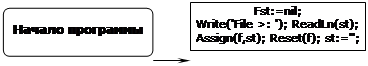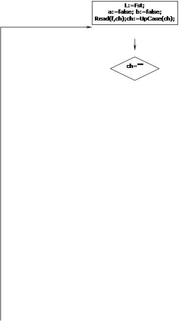 Также в программе используется метка lb. Идентификаторы в языке Pascal – это имена констант, переменных, меток, типов, процедур, функций и полей в записях. Идентификаторы могут состоять максимум из 63 символов. Идентификатор всегда начинается буквой, за которой могут следовать буквы и цифры, а также символ подчеркивания. Пробелы и специальные символы алфавита не могут входить в идентификатор. Специальные символы: + - * / = ' . : ; < > [ ] ( ) { } ^ @ $ # ! ~ % К специальным символам относятся также следующие пары символов: <> <= >= := (* *) (. .) Вначале программы указателю Fst присваивается значение nil. Этот указатель, содержит адрес первого элемента списка L, который будет содержать все имена идентификаторов программы, а также число вхождений идентификаторов в программе. Далее программа печатает на экран строку "File >: ". После этого требуется ввести путь к файлу, содержащего текст программы, и его имя и нажать клавишу "Enter". Этот путь и имя файла считываются в переменную st. Далее файловая переменная f связывается с именем файла, содержащимся в переменной st, в результате обращения к стандартной процедуре ASSIGN. Далее программа инициирует файл для чтения с помощью стандартной процедуры RESET. При выполнении этой процедуры дисковый файл подготавливается к чтению информации. В результате специальная переменная-указатель, связанная с этим файлом, f будет указывать на начало файла, т. е. на компонент с порядковым номером 0. После этого переменной st присваиваем пустую строку. Далее организуется цикл с помощью операторов REPEAT и UNTIL, который выполняется до тех пор пока переменная типа char сh не станет равной символу EOF (код #26). В этом цикле программа будет считывать символы из текстового файла и записывать их в переменную ch. Если перед выполнением чтения указатель файла достигнет конца очередной строки, то результатом чтения будет символ CR (код #13), а если достигнут конец файла, то – символ EOF (код #26). В результате работы этого цикла весь текстовый файл будет считан и сформирован список идентификаторов, а также число их вхождений в тексте программы на языке Pascal. Вначале цикла указатель L, который имеет адрес произвольного элемента списка L, принимает значение указателя Fst. Затем переменным а (признак конца слова) и b (Признак наличия текущего слова в списке L) присваивается значение false. Далее с помощью стандартной процедуры READ из файловой переменной f считывается символ, на который указывает указатель файла, в переменную ch. В первом цикле это будет первый символ текстового файла. При помощи стандартной процедуры UPCASE программа из преобразует символы латинского алфавита от "а" до "z" в прописные буквы. Если же это прописная буква или любой другой символ, то в результате преобразования ничего не изменится. Далее программа исключает слова, которые стоят между двумя одинарными кавычками. Чаще всего это текст, который печатается стандартной процедурой WRITE. Проверяется условие, если символ в переменной ch является символом " ' ", то тогда начинается цикл, образованный операторами REPEAT и UNTIL. В этом цикле программа считывает из файла в переменную ch символы до тех пор пока символ в переменной ch снова не будет равен символу " ' ". Далее цикл завершается, и переменная ch будет содержать символ " ' ". Далее аналогичным способом программа исключает комментарии, встречающиеся в тексте программы, т. е. текст сто