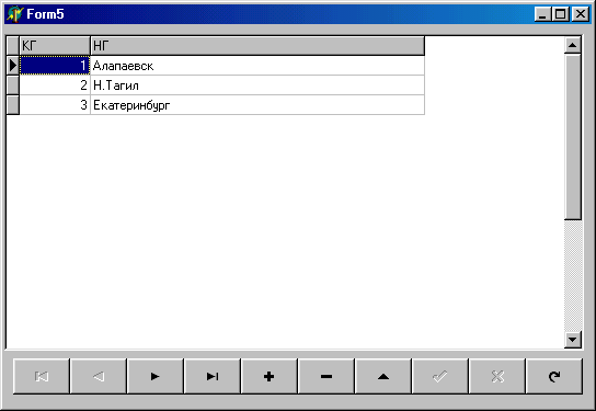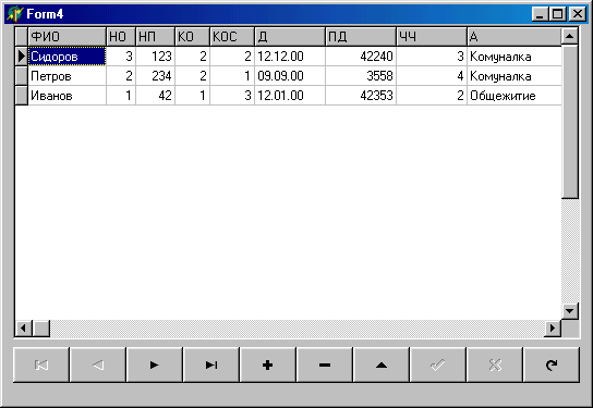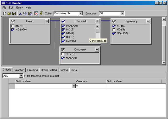 В списке Database выберем базу Uchjt Используя список Таblе, выберем таблицы очередники, города, организации, основания. Мышкой установим связь между этими таблицами по полям NO и КO соответственно Галочкой пометим поля, выводимые в запрос На странице Criteria зададим условия отбора записей. На странице Sorting задается список полей сортировки в порядке убывания приоритетов Порядок сортировки задается кнопками А..Z (по возрастанию), Z...А (по убыванию) Для проверки запроса нажмем кнопку Execute Querу. Кнопкой Savе the current query сохраним его в базе под именем ВаzoviZapros, ею можно посмотреть и откорректировав редактором запроса, вызываемого кнопкой Show and Edit SQL. Для отображения запроса на форме, в редакторе полей дпя объекта Оuегу1 добавим все или отдельные поля запроса. Разместим компонент DBGrid на форме со значением его свойства DataSource, равным DataModule2. SourceBazoviiZapros, сформируем столбцы этой таблицы Запрос может быть