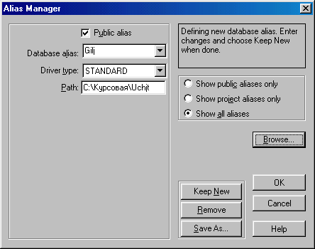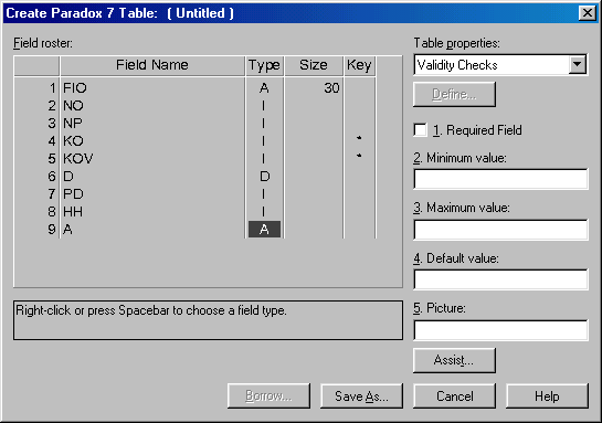 основные колонки и поля окна конструктора таблиц. Туре - тип поля (указывается выбором из контекстного меню): А1рhа (А - строка из не более чем 255, символов), Number (N - число с плавающей точкой), Моnеу ($ - аналогичен типу NumЬег, но добавляется денежный знак), Short (S - целое число в диапазоне -32768..32767), LongIntereger (I целое число в диапазоне-2147483.. 2147483647), ВСD (# - число в двоично-десятичном формате), Datе (D - дата). Time (Т - время), Timestamp (@ - дата и время), Меmо (М - строка любой длины), Formatted Memo (F - аналогичен Меmо, но может содержать форматированный текст), Graphic (G -изображение ВМР, РСХ, ТIF, СИР, ЕРS), ОLЕ (О - объект ОLЕ), Logical (L логическое - Т, F), Autoincrement (+ - при добавлении записи, автоматически формируется уникальное значение), Вinary (В – последовательность байтов любой длины), Вуtes (У последовательность не более, чем 255 байтов). Size- размер поля в байтах. Кеу - признак первичного