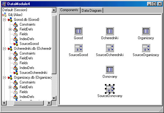 Directory установим текущий каталог, Таблица Очередники будет иметь поля: ФИО, № очереди, № приказа, Код организации, Код основания, Дата, Паспортные данные, Число членов семьи, Адрес. Первичными ключами служат поля Код организации и Код основания. Все поля, являются обязательными. Таблицы Организации и Основания будут иметь ключевые поля (код организации\оснолвания). Для корректировки и просмотра открытой таблицы имеются команды ТаЫе/Restructure (кнопка Restructure) и ТаЫе/Into Structure. Для переименования таблицы следует сохранить ее под новым именем. Для заполнения и редактирования таблицы, после ее связывания с другими таблицами, испочьзуется кнопка Edit Data и меню Record приложения Database Deskot (кириллицу при вводе использовать нельзя). Создание модуля данных Модуль данных содержит объекты, связанные с базой, и используется для централизованного управления этими объектами. Его создание производится командой File/New/Data Module. Имя созданного модуля данных лучше сохранить для наглядности под новым именем, например: DataModulGilj. Разместим компонент Table с панели Data Access на странице Components и выделим его. Зададим свойства: DataBaseNaine=Ychjt (псевдоним базы), TableName=Oheredniki (имя таблицы), Name=Oheredniki (имя компонента приравняем имени таблицы для наглядности Active=True (чтобы можно было обращаться к таблице из программы). Аналогично сделаем для трех оставшихся таблиц. Далее разместим компонент Data Source (источник данных) и выделим его. Зададим свойства: DataSet=Ocheredniki (имя таблицы) , Name=SourceOcheredniki (имя компонента).
