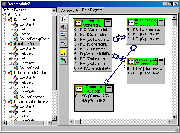 присвоим значения МаsterSouгсе =SourceOcheredniki, Маster, Существует визуальный способ установки связей Выберем модуль данных и откроем страницу Data Diagram окна DataModule2 Перенесем последовательно мышкой из проводника этого окна узлы с именами таблиц Ocheredniki, Orgahizacy, Gorod, Osnovany на страницу Data Diagram Щелкните на кнопке Маster Datail Проведите линию при нажатой левой кнопке мыши от таблицы Ocheredniki до таблицы Organizacy; появится окно Field Link Designer. Установите значения для полей и нажмите кнопку Аdd и ОК, связь установлена, и появится линия связи. Аналогично устанавливается связь и остальных таблиц. Объекты схемы данных можно прокомментировать: нажмите кнопку Соттеnt В1осК и щелкните мышкой на свободном месте схеме и в появившемся прямоугольнике введите текст комментария, щелкните по кнопке Соттеnt Аlludе и протяните линию от комментария к нужному объекту.