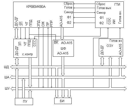 -плата центрального процессора, включающая кроме БИС К580ИК80А (К580ВМ80А) ряд БИС и СИС, с помощью которых реализованы тактовый генератор двухфазных последовательностей импульсов Ф1и Ф2, системный контроллер, формирующий внешние сигналы управления обменной информации в МП-системе, и шинные формирователи адреса и данных, предназначенные для повышения нагрузочной способности шин адреса и данных; -плата памяти, включающая оперативное ЗУ емкостью 1024 восьмиразрядных слова на основе БИС К565РУ2А, предназначенное для записи хранения учебных программ и данных, а так же результатов выполнения программ; -пульт управления и индикации, с помощью которого осуществляется управление работой микроЭВМ и индикации различных режимов работы, содержимого шин адреса и данных. С помощью двух внешних разъемов, расположенных на торцевых стенках стенда, предусмотрена возможность подключения двух модулей программируемого параллельного интерфейса ввода-вывода К580ВВ55, обеспечивающий двунаправленный обмен с внешними устройствами. Основным режимом работы микроЭВМ является режим ВЫПОЛНЕНИЕ ПРОГРАММЫ. Однако, прежде чем приступить к работе, микроЭВМ необходимо запрограммировать. Поэтому наряду с основным режимом микроЭВМ также предусмотрен режим записи и коррекции программ (команд), который в соответствии с одноименным режимом работы МП КР580ВМ80 назван режимом ПРЯМОГО ДОСТУПА К ПАМЯТИ (ПДП). Режим ПДП предназначен для записи информации в ОЗУ, а также использования системной шины другими внешними устройствами. Режим ВЫПОЛНЕНИЯ ПРОГРАММЫ обеспечивает работу микроЭВМ по программе, предварительно записанной в память, в шаговом или автоматическом режиме. Для организации указанных режимов работы на передней панели стенда устройства ввода размещен ряд элементов управления, назначение которых следующее: ЗУ/КЛАВ – переключатель (тумблер), определяющий источник данных и команд. В положении ЗУ осуществляется чтение команд и данных из памяти или в память, в положении КЛАВ – с клавиатуры (без обращения к содержимому ЗУ); ЗПД – тумблер, с помощью которого обеспечивается формирование сигнала «Запрос прямого доступа к памяти». Реагируя на этот сигнал, МП переходит в режим ПДП, при котором ША и ШД МП отключается от системных шин. Благодаря этому, появляется возможность непосредственного обращения к элементам ОЗУ микроЭВМ с помощью клавишных регистров адреса и данных. Установление режима ПДП необходимо контролировать по светодиодному индикатору ППД (подтверждение прямого доступа). Если при включенной клавише ЗПД индикатор ППД не горит, необходимо нажать кнопки НУ и ПУСК; КЦ/МЦ – тумблер, задающий работу МП по командным или машинным циклам в пошаговом режиме. Тумблер НЕПР/ШАГ и кнопка ПУСК обеспечивают работу МП в непрерывном или пошаговом режиме при выполнении программы. При этом зависимости от положения переключателя КЦ/МЦ в пошаговом режиме реализуется выполнение одного командного или машинного цикла.