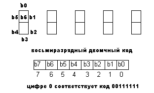 Р Изучение простейших технических средств организации интерфейса микропроцессорных систем выполняется на стенде ТУМ1 с помощью четырех- или шестиразрядного дисплеев на семи сегментных индикаторах (ДСИ). В большинстве МП-систем обмен информации между МП и периферийными устройствами осуществляется через специальные схемы сопряжения (интерфейсные схемы), выполненные на основе интегральных схем малой степени интеграции или в виде специальных БИС. В простейшем случае роль промежуточного устройства сопряжения между МП и устройством ввода-вывода выполняет регистр часто называемый портом. Работу подобного порта можно изучить с помощью четырехразрядного дисплея, в состав ДСИ входят четыре восьмиразрядных регистра с соответствующими схемами управления и четыре семи сегментных индикатора. К системным шинам адреса, данных и управления МП-системами ДСИ подключается через внешний разъем. Семи сегментные индикаторы позволяют отображать все десятичные цифры и ряд букв русского и латинского алфавитов. Кодирование отображаемых символов осуществляется восьмиразрядным двоичным кодом: сегменту b0 соответствует установка в «1» разряда d0 аккумулятора, сегменту b1 – установка в «1» d1 и т.д. принцип кодирования показан на рис. 3.Вывод информации осуществляется по команде Out Port, т.е. вывода содержимого аккумулятора.
