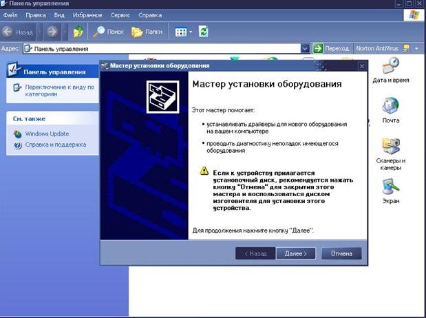 - настройка раскладки клавиатуры, внешнего вида системы (шрифты, цвет, звуковое сопровождение и т.д.). - настройка частоты и разрешения монитора, появление заставки. - настройка скорости передвижения курсора, скорости двойного щелчка, вида курсора. Эти умения позволяют минимально сконфигурировать операционную систему, так сказать под себя, под свои вкусы и требования, и являются базой для последующего изучения возможностей операционной системы. Установка оборудования При работе с РС широко используются разные дополнительные устройства: принтеры, сканеры, модемы, цифровые камеры и прочее оборудование совместимое с компьютером. Поэтому необходимо уметь подключать, устанавливать, настраивать оборудование. Большинство современное компьютерной техники имеет индекс «Plug and Play», что дословно значит «подключи и играй». Это значит, что это устройство автоматически определяется системой, и потом просто просит вставить диск с драйвером оборудования. В операционных системах Windows имеется специальная программа для подключения оборудования – «мастер подключения оборудования». Он значительно упрощает работу с техникой. Он находится на панели управления. Также с помощью мастера можно устранять неполадки.