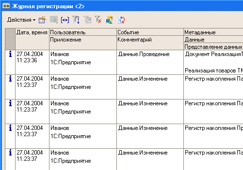 Журнал регистрации доступен как в режиме 1С:Предприятие, так и в режиме Конфигуратор. В режиме 1С:Предприятие по щелчку мыши в полях Данные и Представление данных можно перейти к тому объекту прикладного решения, который указан в записи журнала регистрации. Информацию, находящуюся в журнале регистрации, можно отбирать по большому количеству критериев. Например, можно отобрать только информацию о том, какие документы изменялись определенным пользователем в заданный промежуток времени: