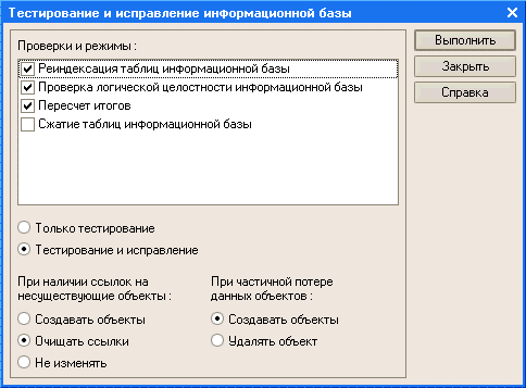Используя средства работы со списками, разработчик имеет возможность выгрузить журнал регистрации в текстовый или табличный документ, который в дальнейшем может быть сохранен в собственном формате или, например, формате листа Excel или документа HTML. Загрузка и выгрузка информационной базыТекущая информационная база может быть выгружена в файл на диске или загружена из файла. Эти операции могут использоваться, например, для создания архива информационной базы и восстановления какой-либо копии базы из архива. Также выгрузка и загрузка информационной базы используется для переноса базы из файлового варианта в клиент серверный и обратно. При загрузке и выгрузке информационной базы система открывает стандартный диалог выбора файла. Следует учитывать, что при загрузке базы из файла, текущая информационная база будет полностью заменена загружаемой. В случае, когда выгрузка информационной базы используется для создания архивных копий, администратор может автоматизировать этот процесс, используя возможность запуска конфигуратора в пакетном режиме. Тестирование и исправление информационной базыПроцедура тестирования и исправления информационной базы служит для диагностики и устранения ошибочных состояний информационных баз, имеющих различный формат хранения данных (файловый или клиент-серверный):