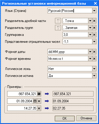 Процедура позволяет выбрать проверки и режимы, которые должны быть выполнены для текущей информационной базы. Для баз, использующих клиент-серверный вариант, возможна проверка логический целостности данных и пересчет итогов. Для баз, использующий файловый вариант, в дополнение к этим проверкам, может быть выполнена реиндексация таблиц и сжатие информационной базы. Имеется возможность выполнять только тестирование или тестирование с исправлением. Причем, возможен выбор нескольких вариантов исправления конфликтных ситуаций. Следует заметить, что тестирование и исправление информационной базы может выполняться только в монопольном режиме (т.е. работа пользователей с информационной базой в процессе тестирования и исправления невозможна). Региональные установки информационной базыНастройка региональных установок информационной базы позовляет управлять форматом отображения даты, времени, чисел и логических констант в прикладном решении: