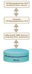 На одном из компьютеров работает сервер 1С:Предприятия 8.0. Программа, работающая у пользователя, взаимодействует с сервером 1С:Предприятия 8.0, а сервер при необходимости обращается к базе данных MS SQL Server. При этом физически сервер 1С:Предприятия 8.0 и MS SQL Server могут располагаться как на одном компьютере, так и на разных. Это позволяет администратору при необходимости распределять нагрузку между серверами.