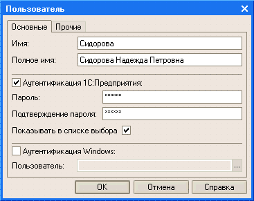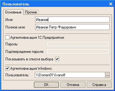 При выполнении аутентификации средствами Windows, от пользователя не требуется каких-либо действий по вводу логина и пароля. Система анализирует, от имени какого Windows-пользователя выполняется подключение к прикладному решению, и на основании этого определяет соответствующего пользователя 1С:Предприятия. При этом диалог аутентификации 1С:Предприятия не отображается, если не указан специальный параметр командной строки. Аутентификацию средствами Windows имеет смысл использовать для NT-подобных операционных систем, например NT, 2000, XP. Если для пользователя не указан ни один из видов аутентификации, - такому пользователю доступ к прикладному решению закрыт. Система 1С:Предприятие позволяет вести список пользователей, которым разрешена работа с системой. Этот список не является частью прикладного решения, а создается отдельно в конкретной организации, в которой используется система:
