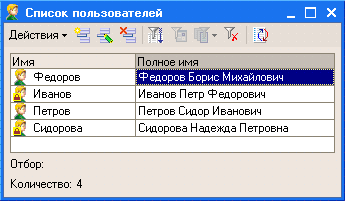Администратор информационной базы имеет возможность добавлять, удалять пользователей, а также модифицировать данные пользователя. Создание новых пользователей возможно также путем копирования уже существующих пользователей.