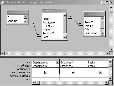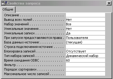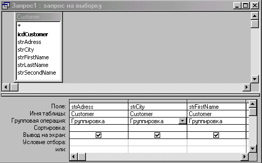 M Мал. 6. Вікно бланка запиту Звичайно, користувач вибирає тільки деякі поля, які при виконанні запиту на вибірку необхідно включити в набір записів. Але якщо розробляється запит для використання в формі, і потрібно, щоб всі поля з усіх базових таблиць запиту були доступні в цій формі, встановлюється для властивості Вывод всех полей значення Да. В більшості випадків краще залишити для цієї властивості встановлене з мовчазної згоди значення Нет, а змінювати цю установку тільки для визначених запитів. В залежності від складності запиту Access може знадобитися декілька секунд (хвилин), щоб знайти всі рядки і почати вивід інформації на екран. Якщо користувача цікавлять тільки “перші” або “верхні” рядки набору записів, треба скористатися властивістю Набор значений для виводу інформації на екран, як тільки Access знайде перші n або перші % рядків. Якщо ввести ціле значення, Access виведе на екран результат відразу, щойно знайде задане число рядків. При введенні десяткового значення менше 1 Access почне вивід даних після того, як знайде приблизно такий відсоток рядків. Слід врахувати, що при виконанні сортування Access повинен спочатку відібрати всі записи, і тільки відсортувавши їх, він може визначити перші n рядків. В цьому випадку властивість Набор значений не прискорить вивід інформації на екран. При виконанні запиту часто виникають ситуації, під час яких Microsoft Access знаходить рядки, що повторюються. З мовчазної згоди він включає в результуючий набір тільки унікальні записи. Це означає, що ідентифікатор кожного рядка (первинний ключ таблиці для запиту з єдиною таблицею або сполучення первинних ключів для багатотабличного запиту) унікальний. Якщо користувач не просить Access повертати унікальні значення, в набір записів запиту будуть включені тільки відмінні один від одного рядки. Якщо є потреба бачити всі дані (враховуючи рядки-дублікати), необхідно встановити обидві властивості Уникальные значения і Уникальные записи - в значення Нет. Користувач не зможе змінювати поля в наборі записів запиту, якщо для властивості Уникальные записи встановлене значення Нет. Якщо база даних буде використовуватися в мережі в режимі колективного доступу, то для забезпечення безпеки даних можна дати доступ іншим користувачам до таблиць тільки за допомогою запитів. Власник таблиці завжди має до неї повний доступ. Можна заборонити всім доступ до таблиць і дозволити проглядати деякі дані тільки визначеним користувачам. Ця умова буде працювати, якщо для властивості При запуске предоставляются права встановити значення Пользователя. Якщо для тих, хто використовує конкретний запит, потрібно дозволити “успадкувати права власника” на доступ до таблиць, треба встановити для властивості При запуске предоставляются права значення Владельца. Якщо запит призначений для роботи в режимі колективного доступу, то для забезпечення цілісності даних при редагуванні використовується властивість Блокировка записей. Access скористається блокуванням тільки в тому випадку, коли в вихідну таблицю потрібно записати рядок. Щоб запис блокувався при внесенні до нього змін одним з користувачів, встановлюється для цієї властивості значення Изменяемой записи. Більш жорстка установка Всех записей блокує всі записи, відібрані запитом, до тих пір, допоки запит відкритий одним з корис