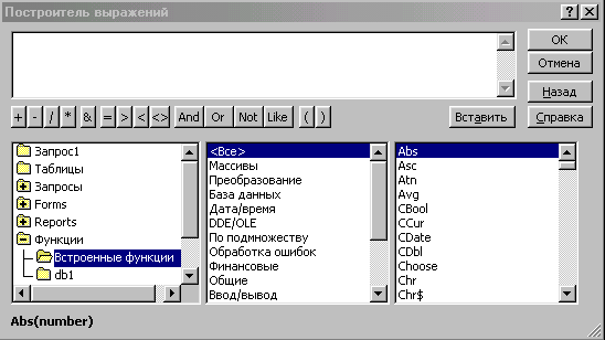 Д Мал. 5. Створювач виразів В верхній частині цього вікна міститься пуста область введення, яка призначена для створення виразів. Можна самому ввести вираз, але легше використати різні кнопки операторів, які містяться прямо під областю введення. В нижній частині вікна знаходяться три списки, призначені для пошуку імен імен полів і функцій, необхідних для створення виразів. Наприклад, в нас є таблиця з даними про учнів 8-А класу, складається вона з таких полів: Прізвище, Ім'я, По батькові, Дата народження, Фізика, Хімія, Алгебра, Геометрія, Історія, Українська література, Українська мова. Формат останніх семи полів числовий (оцінки за 12-ти бальною шкалою). Необхідно обчислити середню оцінку за навчання для кожного учня. В бланку запита вибирається вільне поле і запускається Построитель выражений. В нижній частині вікна, що з’явилося, в правому полі відшукуємо таблицю, на основі якої будується запит. При виборі таблиці, у центральному списку з’являються назви полів. Саме з цього списку потрібно обрати необхідні поля. Формула, за якою пройде обчислення така: Середня оцінка=Сума оцінок по всім предметам/Кількість предметів У верхньому вікні Построителя выражений ця формула набуде такого вигляду: Выражение1:([8Аклас]![Фізика]+[8Аклас]![Хімія]+[8Аклас]![Алгебра]+ [8Аклас]![Геометрія]+[8Аклас]![Історія]+ [8Аклас]![Українська література]+[8Аклас]![Українська мова])/7 Щоб не вводити назви полів вручну, достатньо двічі клацати на них в нижньому середньому списку і вони будуть з’являтися автоматично в верхній області введення. Якщо при побудові виразу потрібно додати стандартну вбудовану функцію, потрібно в лівому нижньому списку вибрати папку Функции/Встроенные функции. В результаті в правому списку з’являться назви функцій. Створивши вираз, в бланку запита можемо дати ім’я новому стовпчику. Для цього акуратно замість слова Выражение1 вводимо власну назву (більш змістовну). Після всіх виконаних попередніх дій потрібно перейти в режим таблиці і оглянути отримані результати. Якщо вони не задовольняють, треба повернутися в режим конструктора і виправити помилки. В разі потреби можна задати порядок сортування даних. Для цього клацнути по рядку Сортировка в стовпчику того поля, по значенням якого потрібно відсортувати записи, і вибрати По возрастанию або По убыванию. Підсумкові запити Іноді цікаві не окремі записи таблиці, а підсумкові значіння по групам даних. Наприклад, нам потрібно знати середню оцінку з Фізики для 8-А класу (з попереднього прикладу). Або сумарну кількість балів з Хімії, набрану класом, в порівнянні з паралельним класом. Відповіді на такі питання дає підсумковий запит. Для обчислення підсумкових значінь потрібно натиснути кнопку Групповые операции на панелі інструментів конструктора запитів, щоб у бланку QBE з’явився рядок Групповая операция. Коли натиснути кнопку Групповые операции на панелі інструменті, Access використовує установку Группировка в рядку Групповая операция для любого поля, який занесений в бланк запиту. Тепер записи по кожному полю групуються, але підсумок не підводиться. Для отримання підсумків потрібно замінити установку Группировка в рядку Групповая операция на конкретну підсумкову функцію. Access дає дев’ять функцій, які забезпечують виконання групових операцій. Можна ввести ім’я функції з клавіатури в рядку