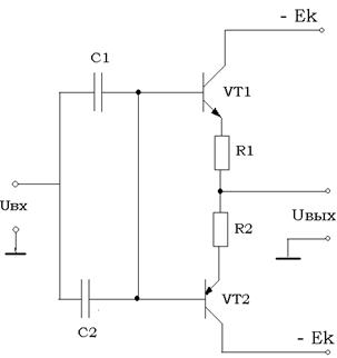 Это схема двухтактного усилителя мощности работающего в режиме В. Двухтактный усилитель мощности обладает более низким коэффициентом нелинейных искажений, чем однотактный усилитель мощности. Также важным преимуществом двухтактной схемы является ее малая чувствительность к пульсациям питающих напряжений. Недостатком данной схемы является трудность подбора одинаковых транзисторов.
