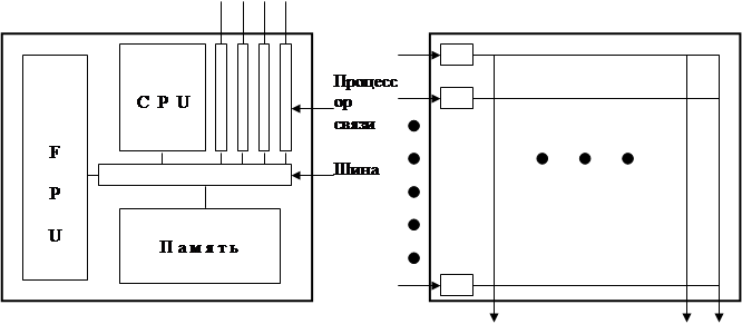 Рис. 1.3 Транспьютер и микросхема маршрутизатора SIMD машины имеют один интерпретатор инструкций, но команды выполняются большим числом арифметических блоков. Ясно, что эти блоки имеют недостаток автономности, которая требуется в нашем определении распределенных систем, и поэтому SIMD компьютеры не будут рассматриваться в этой книге. MIMD машины состоят из нескольких независимых процессоров и они классифицируются как распределенные системы. Процессоры обычно оборудуются специальной аппаратурой для коммуникации с другими процессорами. Коммуникация между процессорами может иметь место либо через шину, либо через соединения точка-точка. Если выбрана шинная организация, то архитектура масштабируема только до определенного уровня. Очень популярным процессором для разработки многопроцессорных компьютеров является транспьютер, разработанный Inmos; см. рис. 1.3. Транспьютер состоит из центрального процессора (CPU), специального блока с плавающей точкой (FPU), локальной памяти, и четырех специальных процессоров. Чипы очень хорошо подходят для построения сетей степени 4 (т.е. каждый узел соединен с четырьмя другими узлами). Inmos также производит специальные чипы для коммуникации, называемые маршрутизаторами. Каждый маршрутизатор может одновременно обрабатывать трафик 32 транспьютерных соединений. Каждое входящее сообщение просматривается на предмет того, по какой связи оно может быть перенаправлено; затем оно направляется по это связи. Другой пример параллельного компьютера это система Connection Machine CM-5, разработанная Thinking Machines Corporation [LAD92]. Каждый узел машины состоит из быстрого процессора и обрабатывающих блоков, таким образом, предлагая внутренний параллелизм в добавление параллелизму, происходящему благодаря наличию нескольких узлов. Так как каждый узел имеет потенциальную производительность 128 миллионов операций в секунду, и одна машина может содержать 16384 узлов, полная машина может выполнять свыше 1012 операций в секунду. (Максимальная машина из 16384 процессоров занимает комнату 900 м2 и скорее всего очень дорогая.) Узлы СМ-5 соединены тремя точка-точка коммуникационными сетями. Сеть данных, с топологией толстого дерева, используется для обмена данными по технологии точка-точка между процессорами. Сеть управления, с технологией бинарного дерева, осуществляет специальные операции, такие как глобальная синхронизация и комбинирование ввода. Диагностическая сеть невидима для программиста и используется для распространения информации о вышедших из строя компонентах.. Компьютер может быть запрограммирован как в режиме SIMD, так и в (синхронном) MIMD режиме. В параллельном компьютере вычисления поделены на подвычисления, каждое осуществляется одноим из узлов. В репликационной системе каждый узел проводит вычисление целиком, после чего результаты сравниваются для того, чтобы обнаружить и скорректировать ошибки. Построение многопроцессорных компьютеров требует решения нескольких алгоритмических проблем, некоторые из которых подобны проблемам в компьютерных сетях. Некоторые из этих проблем обсуждаются в этой книге. (1) Разработка системы передачи сообщений. Если многопроцессорный компьютер организован как сеть точка-точка, то должна быть разработана коммуникационная система. Это обладает проблемами подобными тем, которые возникают в