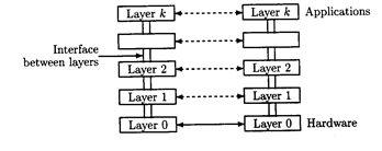 Рис 1.4 Слоеная сетевая архитектура Программное обеспечение для выполнения компьютерных сетей связей очень усложнено. В этом разделе объяснено, как это программное обеспечение обычно структурируется в ациклически зависимых модулях названных уровнями (Подраздел 1.2.1). Мы обсуждаем два стандарта с сетевой архитектурой, а именно, модель МЕЖДУНАРОДНОЙ ОРГАНИЗАЦИИ ПО СТАНДАРТИЗАЦИИ Соединения Открытых систем, стандарт для глобальных сетей, и дополнительного стандарта IEEE для локальных сетей (Подразделы, 1.2.2 и 1.2.3). Также языки, используемые для программирования распределили системы, кратко обсуждены (Подраздел 1.2.4). Сложность задач, выполняемых подсистемой связи распределенной системы требует, чтобы эта подсистема была разработана высоко структурированным способом. К этому моменту, сети всегда организовываются как совокупность модулей, каждое выполнение очень специфическая функция и основывающаяся на услугах, предлагаемых другими модулями. В сетевых организациях имеется всегда строгая иерархия между этими модулями, потому что каждый модуль исключительно использует услуги, предлагаемые предыдущим модулем. Модули названы уровнями или уровнями в контексте сетевой реализации; см. 1.4 Рисунок. Каждый уровень осуществляет часть функциональных возможностей, требуемых для реализации сети и полагается на уровень только ниже этого. Услуги, предлагаемые i уровнем i + 1 уровню точно описаны в интерфейсе i уровня и i + 1 уровня (кратко, i / (i + 1) интерфейс). При проектировании сети, в первую очередь, нужно определить число уровней и интерфейсов между последующими уровнями. Функциональные возможности каждого уровня должны быть выполнены распределенным алгоритмом, таким, что алгоритм для i уровня решает "проблему", определенную i / (i + 1) интерфейсом, согласно "предположениям", определенным в (i — l) /i интерфейсе. Например, (i — 1) /i интерфейс может определять, что сообщения транспортируются из узла p к узлу q, но некоторые сообщения могут быть потеряны, в то время как i / (i + 1) интерфейс определяет, что сообщения передаются от p до q надежно. Алгоритмическая проблема для i уровня затем - выполнить надежное прохождение сообщения, используя ненадежное прохождение сообщения, что обычно делается с использованием подтверждения и перепередачи потерянных сообщений (см. Подраздел, 1.3.1 и Главу 3). Решение этой проблемы определяет тип сообщений, обменянных процессами i уровня и значение этих сообщений, т.е., как процессы должны реагировать на эти сообщения. Правила и соглашения, используемые в "сеансе связи" между процессами i уровня упоминаются как layer-i протокол. Самый низкий уровень иерархии (уровень 0 на Рисунке 1.4) - всегда аппаратный уровень. Интерфейс 0/1 описывает процедуры, которыми уровень i может передать необработанную информацию через соединяющие провода, и описание уровня непосредственно определяет то, какие типы провода используются, сколько вольт представляют единицу или ноль, и т.д. Важное наблюдение - то, что изменение в реализации уровня 0 (замена проводов другими проводами или спутниковыми подключениями) не требует, чтобы интерфейс 0/1 был изменен. Те же самые условия в более высоких уровнях: интерфейсы уровня служат экраном от реализация уровня для других уровней, и реализация может быть изменена без того, чтобы воздействовать на другие уровни. Под 