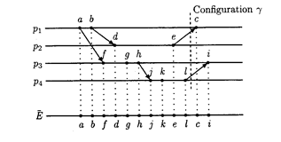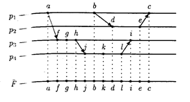 Исполнения F и Е имеют один набор событий, и каузальный порядок этих событий – один и тот же для Е и F. Поэтому, также, в этом случае Е – это перестановка событий из F, которая согласуется с каузальным порядком исполнения F. Если применить условие теоремы 2.21, мы можем сказать, что Е и F – эквивалентные исполнения, что обозначается как E ~ F. Рис. 2.2 показывает временную диаграмму исполнения, эквивалентного исполнению, изображенному на рис. 2.1. Эквивалентные временные диаграммы могут быть получены с помощью «трансформаций резиновой ленты» [Mat89c]. Полагая, что временная ось процесса может быть сжата и растянута пока стрелки сообщений продолжают указывать направо, рис. 2.1 может быть деформирован до рис. 2.2. Хотя изображенные исполнения эквивалентны и содержат одинаковый набор событий, они не могут содержать одинаковый набор конфигураций. Рис. 2.1 содержит конфигурацию (g”), в которой сообщение, посланное в событии е и сообщение, посланное в событии l, передаются одновременно . Рис. 2.2 не содержит такой конфигурации, потому что сообщение, посланное в событии l, получено перед свершением события е. Глобальный наблюдатель, кто имеет доступ к действительной последовательности событий, может различать два эквивалентных исполнения, т.е. может наблюдать либо одно, либо другое исполнение. Однако, процессы не могут различать две эквивалентных исполнения, т.к. для них невозможно решить, какое из двух исполнений имеет место. Это иллюстрируется следующим. Предположим, что мы должны решить будут ли посылаться сообщения в событии е и будут в передаче одновременно. Существует булевская переменная sim в одном из процессов, которая должна установлена в истину, если сообщения были в передаче одновременно, и ложь иначе. Таким образом, в последней конфигурации рис. 2.1 значение sim – истина, и в последней конфигурации на рис 2.2 значение – ложь. По теореме 2.21, конфигурации равны, что показывает, что требуемое присваивание sim невозможно. Класс эквивалентности при отношении ~ полностью характеризуется набором событий и каузальным порядком на этих событиях. Классы эквивалентности называются вычислениями алгоритма. Определение 2.22 Вычисление распределенного алгоритма – это класс эквивалентности (при ~) исполнений алгоритма. Не имеет смысла говорить о конфигурациях вычисления, потому что различные исполнения вычисления могут не иметь одних и тех же конфигураций. Имеет смысл говорить о наборе событий вычисления, потому что все исполнения вычисления состоят из одного и того же набора событий. Также, каузальный порядок событий определен для вычисления. Мы будем называть вычисление конечным, если его исполнения конечны. Все исполнения вычисления начинаются в одной конфигурации и, если вычисление конечно, завершаются в одной конфигурации (теорема 2.21). Эти конфигурации называются начальными и конечными конфигурациями вычисления. Мы будем определять вычисление с помощью частично упорядоченного множества событий, принадлежащих ему. Результат из теории частичных порядков подразумевает, что каждый порядок может встречаться для пары конкурирующих событий вычислений. Факт 2.23 Пусть (Х, <) будет частичным порядком и а, b Î Х удовлетворяют b ³ a. Существует линейное расширение <1 операции < такое, что а <1 b. Следовательно, если а и b – конкурирующие события вычисления С, существуют