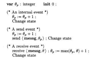 Алгоритм 2.3 Логические часы Лампорта (3) Логические часы Лампорта. Лампорт [Lam78] представил часовую функцию, которая приписывает событию а длину k самой длинной последовательности (е1, …, еk) событий, удовлетворяющей е1 í е2 í … íеk = a В самом деле, если а í b, эта последовательность может быть расширена, чтобы показать, что QL(a) < QL(b). Значение QL может быть вычислено для каждого события распределенным алгоритмом, базируясь на следующих отношениях. (а) Если а есть внутреннее событие или событие посылки, и а’ – предыдущее событие в том же процессе, то QL(a) = QL(a’) + 1. (b) Если а – событие получение, а’ – предыдущее событие в том же процессе, и b –событие посылки, соответствующее а, то QL(a) = max(QL(a’), QL(b)) + 1. В обоих случаях QL(a’) предполагается нулевым, если а – первое событие в процессе. Чтобы вычислить значения часов распределенным алгоритмом, значение часов последнего события процесса р сохраняется в переменной qр (инициализируемой в 0). Для того, чтобы вычислить значение часов события получения, каждое сообщение m содержит значение часов qm события е, при котором оно было послано. Логически часы Лампорта даны как алгоритм 2.3. Для события е в процессе р, QL(е) есть значение qр сразу же после появления е, т.е. в момент, когда происходит изменение состояния процесса р. Оставлена для упражнения демонстрация того, что с этим определением QL является часами. Не указывается при каких условиях сообщение должно быть послано или как меняется состояние процесса. Часы –это дополнительный механизм, который может быть добавлен к любому распределенному алгоритму, чтобы упорядочивать события. (4) Векторные часы. Для некоторых целей полезно иметь часы, который выражают не только каузальный порядок (как требуется по определению 2.25), но также и конкуренцию. Конкуренция выражается часами, если конкурентные события помечаются несравнимыми значениями часов, то есть, следствие в определении 2.25 заменяется на эквиваленцию, давая a í b Û Q(а) < Q(b). (2.1) Существование конкурирующих событий подразумевает, что область таких часов (множество Х) – не-полностью-упорядоченное множество. В векторных часах Маттерна [Mat89b] X = NN, т.е. Qv(a) есть вектор длины N. Вектора длины n естественным образом упорядочены векторным порядком, определенным следующим образом: (а1, …, аn) £v (b1, …, bn) Û "i (1 £ i £ n) : ai £ bi. (2.2) (Векторный порядок отличается от лексикографического порядка, определенного в упражнении 2.5, последний порядок абсолютен). Часы, определяемые Qv(a) = (а1, …, аN), аi – это число событий е в процессе р1, для которого е í а. Как и часы Лампорта, эта функция может быть вычислена распределенным алгоритмом. Чаррон-Бост [CB89] показал, что невозможно использовать более короткие векторы (с векторным порядком как в (2.2)). Если события произвольного исполнения из N процессов отображаются на вектора длины n таких, что (2.1) удовлетворяется, то n ³ N. 2.4 Дополнительные допущения, сложность Определений сделанных до сих пор в этой главе достаточно, чтобы развивать оставшиеся главы. Определенная модель служит как основа для представления и проверки алгоритмов, так и для доказательств невозможности для решения распределенных проблем. В различных главах используются дополнительные допущения и нотация, если требуется. Этот раздел обсуждает некоторую терминологию, которая также общеупотребительна в литературе по распределенным алго