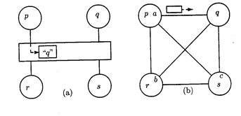 Рис. 2.5 Прямая (а) и непрямая (b) адресация 2.4.5 Сложность распределенных алгоритмов Самое важное свойство распределенного алгоритма – его правильность: он должен удовлетворять требованиям, налагаемым проблемой, что алгоритм В этой главе обсуждаются два протокола, которые используются для надежного обмена данными между двумя вычислительными станциями. В идеальном случае, данными бы просто обменивались, посылая и получая сообщения. К сожалению, не всегда можно игнорировать возможность ошибок связи; сообщения должны транспортироваться через физическую среду, которая может терять, дублировать, переупорядочивать или искажать сообщения, передаваемые через нее. Эти ошибки должны быть обнаружены и исправлены дополнительными механизмами, выполняющимися на вычислительных станциях, которые традиционно называются протоколами. Основная функция этих протоколов - передача данных, то есть, принятие информации на одной станции и получение ее на другой станции. Надежная передача данных включает повторную посылку сообщений, которые потеряны, отклонение или исправление сообщений, которые искажены, и отбрасывание дубликатов сообщений. Для выполнения этих функций протокол содержит информацию состояния, записывая, какие данные уже был посланы, какие данные считаются полученными и так далее. Необходимость использования информации состояния поднимает проблему управления соединением, то есть, инициализации и отбрасывания информации состояния. Инициализация называется открытием соединения, и отбрасывание называется закрытием соединения. Трудности управления соединением возникают из-за того, что сообщение может остаться в каналах связи, когда соединение закрыто. Такое сообщение могло бы быть получено, когда не существует никакого соединения или в течение более позднего соединения, и получение не должно нарушать правильную операцию текущего соединения. Протоколы, обсуждаемые в этой главе разработаны для различных уровней в иерархии протокола, типа модели OSI (Подраздел 1.2.2). Они включены в эту книгу по различным причинам; первый протокол полностью асинхронный, в то время как второй протокол полагается на правильное использование таймеров. В обоих случаях заостряется внимание на требуемом свойстве безопасности, а именно на том, что приемник получит только правильные данные. Первый протокол (Раздел 3.1) разработан для обмена данными между двумя станциями, которые имеют прямое физическое соединение (типа телефонной линии), и, следовательно, принадлежит канальному уровню модели OSI. Второй протокол (Раздел 3.2) разработан для использования двумя станциями, которые связываются через промежуточную сеть (возможно содержащую другие станции и соединяющую станции через различные пути), и этот протокол следовательно принадлежит к транспортному уровню OSI модели. Это различие отражается на функциональных возможностях, требуемых от протоколов, следующим образом. (1) Рассматриваемые ошибки. Для двух протоколов будут рассматриваться различные классы ошибок передачи. Сообщения не могут пересекаться при физическом соединении, и они не могут быть продублированы; таким образом, в разделе 3.1 рассматривается только потеря сообщений (об искажении сообщений см. ниже). В сети сообщения могут передаваться различными путями, и, следовательно, пересекат