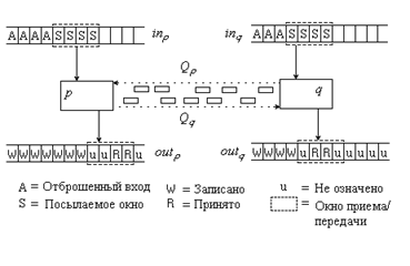 Последствия этих двух лемм отображены на Ðèñóíêе 3.2. Процессу p необходимо хранить только слова inp[ap..sp + lp — 1] потому, что это слова, которые p может послать. Назовем их как посылаемое окно p (представлено как S на Ðèñóíêе 3.2). Каждый раз, когда ap увеличивается, p отбрасывает слова, которые больше не попадают в посылаемое окно (они представлены как A на Ðèñóíêе 3.2). Каждый раз, когда sp увеличивается, p считывает следующее слово из посылаемого окна от источника, который производит слова. Согласно Ëåììе 3.6, посылаемое окно процесса p содержит не более L слов. Подобным же образом можно ограничить память для хранения процессом p массива outp. Т.к. outp[i] не меняется для i < sp, можно предположить, что p выводит эти слова окончательно и более не хранит их (они представлены как W на Ðèñóíêе 3.2). Т.к. outp[i] = udef для всех i ³ sp + L, эти значения outp[i] также не нужно хранить. Подмассив outp[sp..sp +L—1] назовем принимаемое окно p. Принимаемое окно представлено на Ðèñóíêе 3.2 как u для неозначенных слов и R для слов, которые были приняты. Только слова, которые попадают в это окно, хранятся процессом. Леммы 3.6 и 3.7 показывают, что не более 2L слов хранятся процессом в любой момент времени. Ограничение чисел последовательности. В заключение будет показано, что числа последовательности могут быть ограничены, если используются fifo-каналы. При использовании fifo предположения можно показать, что номер порядковый номер пакета, который получен процессом p всегда внутри 2L-окрестности sp. Обратите внимание, что fifo предположение используется первый раз. Ëåììà 3.8 Утверждение P', определяемое как P' º P /\ <pack, w, i> is behind <pack, w', i'> in Qp Þ i > i' - L (4p) /\ <pack, w, i> is behind <pack, w', i'> in Qq Þ i > i' - L (4q) /\ <pack,w,i> ÎQp Þ i³ ap - lp (5p) /\ <pack,w,i> ÎQq Þ i³ aq - lq (5q) является инвариантом Àëãîðèòìа 3.1. Äîêàçàòåëüñòâî. Т.к. уже было показано, что P - инвариант, мы можем ограничиться доказательством того, что (4p), (4q), (5p) и (5q) выполняются изначально и сохраняются при любом перемещении. Заметим, что в начальном состоянии очереди пусты, следовательно (4p), (4q), (5p) и (5q) очевидно выполняются. Сейчас покажем, что перемещения сохраняют истинность этих утверждений. Sp: Чтобы показать, что Sp сохраняет (4p) и (5p), заметим, что Sp не добавляет пакетов в Qp и не меняет ap. Чтобы показать, что Sp сохраняет (5q), заметим, что если Sp добавляет пакет <pack, w, i> в Qq, то i ³ ap, откуда следует, что i³ aq - lq (из Ëåììы 3.3). Чтобы показать, что Sp