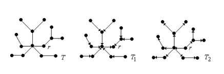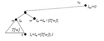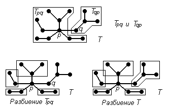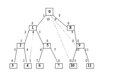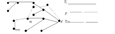 для всякого i= 0,..., k (3)Граф не содержит циклов отрицательной стоимости. ( Этот критерий удовлетворяется критерием самого короткого пути и критерием минимального перехода). Путь от u до v, называется оптимальным, если не существует никакой путь от u до v с более низкой стоимостью. Заметьте, что оптимальный путь не всегда единственен; могут существовать различные пути с той же самой (минимальной) стоимостью. Лемма 4.1. Пусть u, v ÎV. Если путь из u в v существует в G, тогда и существует простой путь, который оптимален. Доказательство. Так как количество простых путей конечное число, то существует простой путь от u до v, назовем его So, с наименьшей стоимостью, т.е., для каждого простого пути P' из u в v C(So)£C(P’). Осталось показать что C(So) нижняя граница стоимостей всех (не простого) путей Запишем V = {v1, ..., vn}. Следовательно, удаляя из P циклов, включающие v1, v1, v2 и т.д., покажем что для каждого пути P из u в v существует простой путь P' с C(P')£ C(P). Положим Po =P, и построим для i = 1,..., N путь Pi следующим образом. Если vi входит в Pi-1 тогда Pi = Pi-1. Иначе, запишем Pi-1 = <uo, ...,uk>. Пусть uj1 будет первым и uj2 будет последним вхождением vi в Pi-1 и положим Pi = <uo, . . . , uj1(=uj2), uj2+1, . . .,uk> по построению Pi - путь из u к v и содержит все вершины из {v1, ..., vn} только единожды, следовательно PN -простой путь из u в v. Pi-1 состоит из Pi и цикла Q= uo, . . . , uj2 следовательно C(Pi-1) = C(Pi) + C(Q). Так как не существует циклов отрицательного веса, это предполагает C(Pi) £ C(Pi-1) и, следовательно, C(PN )£ C(P). По выбору So, C(So) £ C(PN,), из которого следует C(So) £ C(P) [] Если G содержит циклы отрицательного веса, оптимальный путь не обязательно существует; каждый путь может быть «побежден» другим путем, который пройдет через отрицательный цикл еще раз. Для следующей теоремы, примите, что G связный (для несвязных графов, теорема может применяться к каждому связному компоненту отдельно). Теорема4.2. Для каждого d Î V существует Td = (V, Ed) такое что Ed Í E и такое что для каждой вершины v Î V, путь из v к d в Td - оптимальный путь от v к d в G. Доказательство. Пусть V = { v1, ..., vN }. Мы индуктивно построим последовательность деревьев Ti = (Vi, Ei) (для i = 0, ...,N) со следующими свойствами (1) Каждое Ti - поддерево G, т.е., Vi Ì V, Ei Ì E, и Ti - дерево. (2) Каждое Ti (для i < N) поддерево Ti+1. (3) Для всех i > 0, vi Î Vi и d Î Vi. (4) Для всех wÎVi, простой путь от w к d в T, - оптимальный путь от w к d в G. Эти свойства подразумевают, что TN соответствует требованиям для Td. Конструируя последовательность деревьев, положим Vd = {d} и Eo = Æ . Дерево Ti+1 построим следующим образом. Выберем оптимальный простой путь P=<uo, . . ., uk> от vi+1 к d, и пусть l будет наименьшим индексом таким, что ul Î Ti (такое l существует, потому что ul = d Î Ti ; возможно l = 0). Теперь: Vi = Vi È{ uj: j <l} и Ei+1 = Ei È {( uj, uj+1) : j < 1}. (Построение иллюстративно представлено на Рисунке 4.1.) Нетрудно видеть что Ti поддерево Ti+1 и что vi+1 Î Vi+1. Чтобы увидеть что Ti+1 дерево, заметим что по построению Ti+1 связный, и число вершин превосходит число ребер на одно. (To имеет последнее свойство, на каждом шаге много вершин и ребер добавлено)