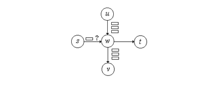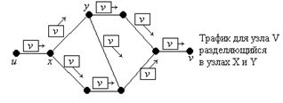 Лемма 4.3 Механизм пересылки доставляет каждый пакет адресату, тогда и только тогда когда таблицы маршрутизации цикл-свободны. Доказательство. Если таблицы содержат цикл для некоторого адресата d, пакет для d никогда не будет доставлен, если источник - узел в цикле. Примем, что таблицы цикл-свободны и позволяют пакету с адресатом d (и источник uo) быть посланным через uo, u1, u2, . .. если один встречается дважды в этой последовательности, скажем ui = uj, тогда таблицы содержат цикл, а именно < ui ..., uj> противореча предположению, что таблицы являются цикл-свободными. Таким образом, каждый узел входит единожды, что подразумевает, что эта последовательность конечна, заканчивающаяся, скажем, в узле Великобританию uk (k < N). Согласно процедуре пересылки последовательность может заканчиваться только в d , то есть, uk = d, и пакет достиг адресата за не больше чем N — 1 шагов В некоторых алгоритмах маршрутизации случается, что таблицы не цикл-свободны в течение их вычисления. Когда такой алгоритм используется, пакет может пересекать цикл в течение вычисления таблиц, но достигает адресата не больше чем N — 1 шагов после завершения вычисления таблицы, если изменения топологии прекращаются. Если изменения топологии не прекращаются, то есть, сеть подчинена бесконечной последовательности изменений топологии, пакеты не обязательно достигают своего адресата, даже если таблицы цикл-свободны во время модификаций; Ветвящаяся маршрутизация с минимальной задержкой. При маршрутизации через пути с минимальной задержкой требуется, и задержка канала зависит от использования (таким образом, предположение (1) в начале этого раздела не имеет силу), стоимость использования пути не может просто быть оценена как функция этого единственного пути. Кроме того, трафик на канал должен быть принят во внимание. Избегать скопления пакетов (и возникающую в результате этого задержку) на пути, обычно необходимо посылать пакеты, имеющие ту же самую пару исходный-адресат через различные пути; трафик для этой пары "распределяется" в один или большее количество узлов промежуточного звена как изображено в Рисунке 4.3. Методы маршрутизации, которые используют различные пути к одному адресату, называются много-путевыми или ветвящимися методами маршрутизации. Потому что ветвящиеся методы маршрутизация являются, обычно, очень запутанными, они не будет рассматриваться в этой главе