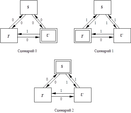 Рисунок 14.5 Сценарии для детерминированного протокола. Чтобы показать нижнюю границу для точности, пусть дан детерминированный