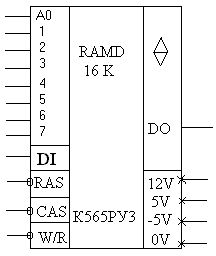 tЗАН-время занятости Страничные режимы записи и считывания реализуют обращением к микросхеме по адресу строки с выборкой ЭП этой строки изменение адреса стлбцов. В этих режимах значительно уменьшается время цикла записи (считывания) поскольку при неизменных сигналах RAS=0 и кода адреса строки использована часть полного цикла записи (считывания), относящаяся к адресации столбцов. Микросхема К565РУ3Г нуждается в трех источниках питания и следует учитывать требования по порядку включения и выключения источников питания: первым включают источник –5В, а отключают последним. Это требование обусловлено тем, что напряжение –5В подается на подложку (кристалл) и если его не подключить первым, то воздействием, даже кратковременным, напряжений двух других источников с напряжением 5 и 12В может произойти в кристалле тепловой пробой. Порядок включения двух других напряжений питания может быть любым. После подачи напряжения питания микросхема К565РУ3Г переходит в нормальный режим функционирования через восемь рабочих циклов. 2.2.Параметры микросхемы К565РУ3ГХарактеристика микросхемы К565РУ3ГЕмкость,бит -16К x 1 Время цикла записи считывания- 370нс Напряжение питания- 5В,12В,-12В Потребляемая мощность: в режиме хранения- 40 мВт в режиме обращения- 460мВт Тип корпуса- ДИП;16;7.5 Статические параметры микросхемы К565РУ3ГI потребления динамический- 45мА I потребления статический- 4Ма U вх низкого уровня мах 0.8B min –1B U вх высокого уровня вах 6В min 2.4B U вых низкого уровня мах 0.4B U вых высокого уровня min 2.4B I вых низкого уровня мах 4мА I вых высокого уровня мах 2мА Выходной ток утечки мах 10мкА Входной ток утечки мах 10мкА Входная емкость по входам WR/RD, RAS, CAS мах 10пФ по входам A, DI мах 6 пФ Выходная емкость мах 10 пФ Максимальная емкость нагрузки 100 пФ 2.3.Расчет нагрузочной способности микросхемы К565РУ3Г Характерным для ДБИС ЗУ, изготовляемых по МДП-технологии, является высокое входное омическое сопротивление. При определении числа Q ДБИС ЗУ, нагружаемых на ТТЛ-схему, учитывается в основном емкость входов микросхемы памяти.