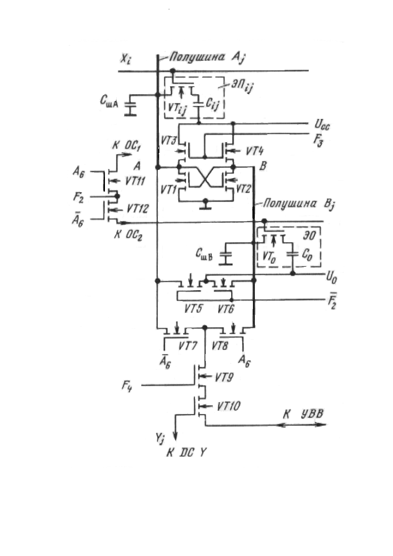 - в DI- входные данные; W/R- запись-считывание; DO- выходные данные; A- адрес; RAS- строб адреса строки; CAS- строб адреса столбца; Микросхема К565РУ3Г информационной емкостью 16Кx1бит. В ее структурную схему (приложение 1) входят выполненные в одном кремниевом кристалле матрица накопителя, содержащая 16384 элементов памяти, расположенных на пересечениях 128 строк и 128 столбцов, 128 усилителей считывания и регенерации, дешифраторы строк и столбцов, устройство управления, устройство ввода-вывода и мультиплексный регистр адреса. Матрица накопителя разделена на две части по 64x64 ЭП в каждой. Между ними размещены усилители, так что каждый столбец состоит из двух секций, подключенных к разным плечам усилителя (приложение 2). Элемент памяти собран по одно-транзисторной схеме и включает конденсатор Cij. Транзистор выполняет функции ключа: при сигнале на адресной шине строки Xi=1 он открывается и соединяет конденсатор Cij с j-разрядной шиной. Предварительно в паузах между обращениями к накопителю емкости полушин США и СШБ заряжает источник напряжения UO через открытые ключевые транзисторы VT5 и VT6. При обращении к накопителю эти транзисторы закрываются и изолируют полушины Aj и Bj от источника напряжения UО Запоминающий конденсатор Сij выбранного ЭП подключается через открытый транзистор Vtij к полушине Aj и изменяет ее потенциал. Это изменение незначительнo, тк емкость запоминающего конденсатора равная 01-02 пФ много меньше емкости шины Поэтому для индикации малого изменения потенциала шины при считывании информации применен высоко чувствительный дифференциальный усилитель тригерного типа на транзисторах VT1-VT4 включенный в середину РШ Кроме массива ЭП и усилителей матрица имеет в своей структуре опорные элементы (ЭО) по одному елементу в каждой полушине Эти элементы вкаждой половине матрицы состовляют опорную строку (ОС) Опорный элемент построен аналогично запоминающему Его назначение состоит в поддержании опорного напряжения UO c которым усилитель сравнивает потенциал полушины с выбранным ЭП и реагирует на получающуюся при сравнении разность потенциалов положительного и отрицательного знака в зависимости от считываемого уровня Эта операция происходит следующем образом: если выбрана для обращения строка верхней полуматрицы Xi то сигнал А6 старшего разряда кода адреса строки коммутирует в селекторе опорной строки цепь через ключевой транзистор VT12 для сигнала F2 к ОС2 расположенной в нижней полуматрице Таким образом в каждом из 128 столбцов к усилителю с разных сторон подключены ЭП и ЭО Поскольку потенциал полушины с ЭП отличается от опорного в проводимости транзисторов разных плеч усилителя-триггера появляется асимметрия которая при включении цепи его питания сигналом F3 вызывает опрогидование триггера по преобладающему уровню В итоге на выходах-входах А и В триггера формируются полные уровни 1 и 0 Тот из сигналов который отражает считываемую информацию в данном примере сигнал с плеча А коммутируется на вход устройства вывода через ключевые транзисторы VT7VT9 и VT10 открываемые сигналами А6 F4 и Yj Очевидно считан может быть только один сигнал с выбранного дешифратором столбца : Yj=1 У остальных столбцов ключи VT10 закрыты Сигнал F4 зависит от наличия сигнала CAS: при отсутствии последнего он не формируется и ключ VT9 закрыт Сигнал на входе-выходе А триггера-усилите