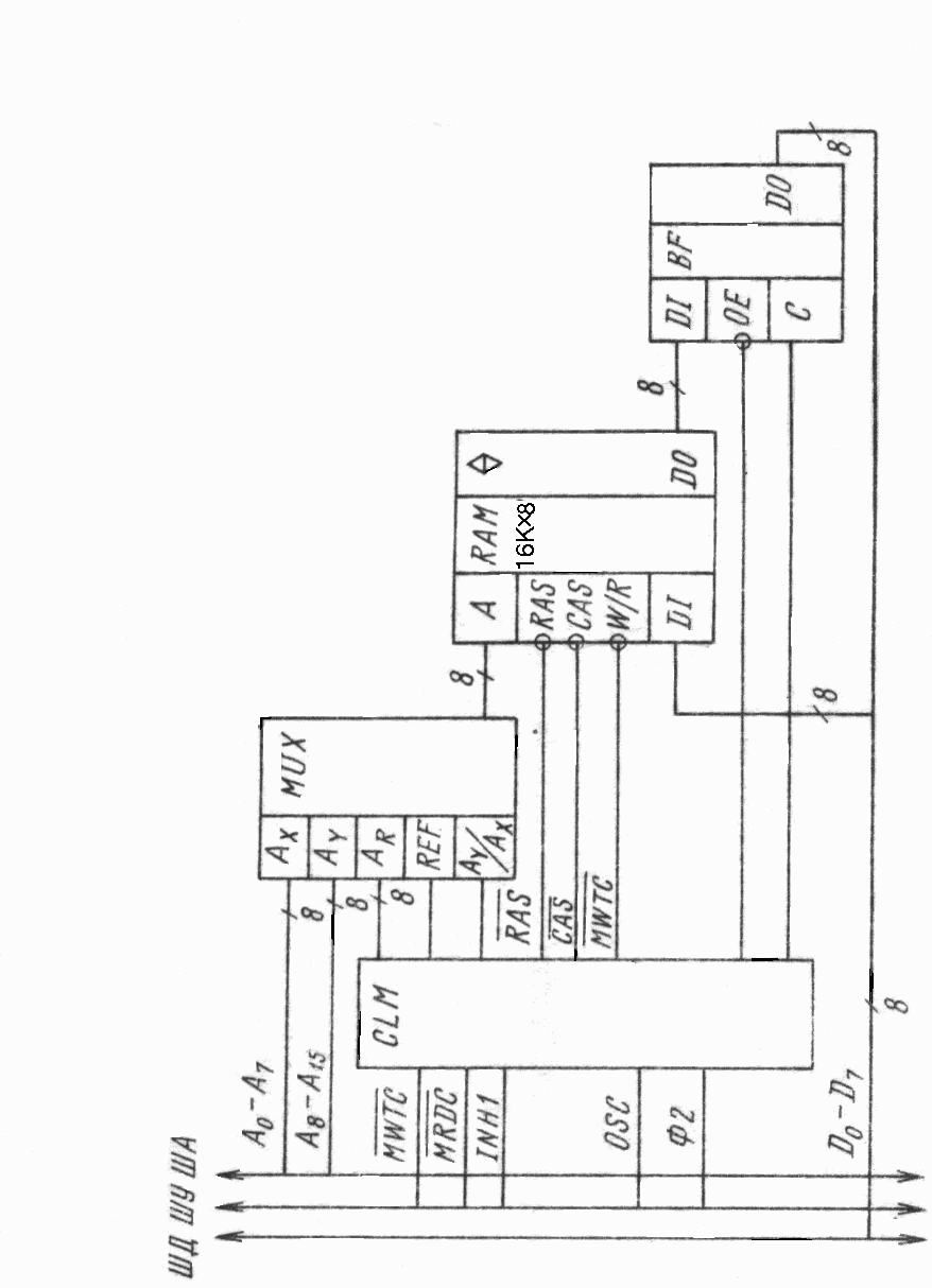 Дата выдачи ____________________________ Срок окончания ____________ Преподаватель-руководитель курсового проектирования . Введение. ОЗУ выполняют запись, хранение и считывание произвольной двоичной информации. Оно является основным устройством памяти цифровых систем, в котором хранятся программы, определяющие процесс текущей обработки информации и массив обрабатываемых данных. Современные цифровые системы ОЗУ строятся из специальных микросхем памяти, которые объединяются в соответствующий функциональный блок. Целью курсового проекта является разработка блока динамического ОЗУ емкостью 16Кбайт для 8-разрядных микропроцессорных устройств и закрепление полученных в процессе изучения дисциплины ЭВМ системы, комплексы и сети знаний по динамической памяти. 1.Организация работы блока динамического ОЗУ с мультиплексором кода адреса. Для реалезации усройства необходимы: накопитель информации, состоящий из микросхем памяти (модуль памяти), и схемы управления.Структурная схема такого блока показана в приложении 4.Модуль памяти, обозначаемый как DD1-DD8 на функциональной схеме (приложение 5), построен на микросхемах К565РУ3Г путем соединения их одноименных выводов, кроме информационных. Сигналы RAS и CAS формирует контроллер ОЗУ CLC. , сигнал MWTC с шины управления подан на вход W/R. Для снижения степени рассогласования с ТТЛ управляющими элементами целесообразно подключение всех адресных и управляющих линий ко входам микросхем памяти осуществлять через резисторы с сопративлением 20-30 Ом. Буфер выходных данных DD13 реализован на парралельном 8-разрядном регистре КР580ИР82. Сигнал управления регистром вырабатывает контроллер ОЗУ. Сигнал ОЕ управляет выходами: при 0 они открыты для считывания, при 1-переходят в третье состояние, сигнал СЕ управляет входами: при 1 они открыты для записи, при 0 блокированы. В блоке ОЗУ буферизованы только его выходные линии. Мультиплексор DD9-DD12 выполненный на схемах К555КП2 обеспечивает последовательный во времени ввод адресного кода строк AX {AO-A7} и столбцов AY {A8-A15} в модуль ОЗУ. Адресные сигналы поступают на входы D0.0, D1.0 и D0.1, D1.1 мультиплексорных микросхем и коммутируются на выхды под управлением сигнала на входе SED2(AY/AX) при наличии на другом управляющем входе SED1(REF) уровня 0. Условия коммутации сигналов: при AY/AX=0 к выходам подключаются каналы D0.0, D0.1 и, следовательно, на адресные входы ОЗУ поступает адрес строк AX; при AY/AX=1 к выходам подключаются каналы D1.0, D1.1 и к ОЗУ направляется код адреса столбцов AY. Сигналы управления: REF- признак режима регенерации и AY/AX-сигнал мультиплексирования каналов, вырабатывает контроллер. В режиме регенерации REF=1 и мультиплексор коммутирует на выходы при изменении AY/AX каналы D2.0, D3.0 и D2.1, D3.1. Но так как указанные каналы попарно соединены, то на результат коммутации сигнал AY/AX влияния не оказывает: при любых его значениях на выходы мультиплексора поступают адреса регенерации AR, вырабатываемые счетчиком контроллера. Эти сигналы адресуют только строки, сигналы адреса столбцов в этом режиме на адресных входах отсутствуют. При отсутствии обращения к ОЗУ, ОЗУ работает только в режиме регенерации. С каждым тактом контроллер формирует сигналы RAS, REF и код адреса очередной строки, и инициирует работу модуля памяти по циклу регенерации. Процесс регенерации прекращается при обращении микропроцессора к ОЗУ, и контролле