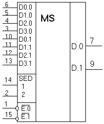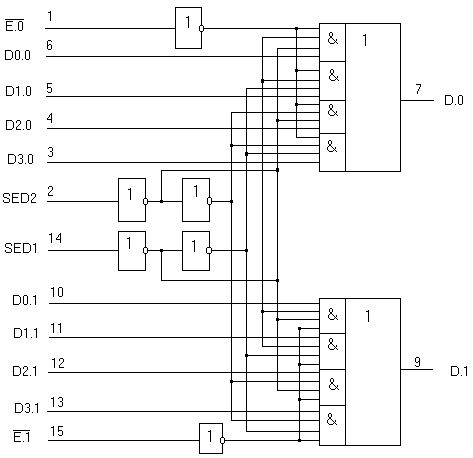 СМАХ- максимальная емкость нагрузки ТТЛ-схемы СI- емкость входа ДБИС ЗУ Т.к. для К555КП2 емкость СMAX≤150Пф, а для К565РУ3Г емкость СI≈ 6-10Пф, то Q≤15-25. Выход К565РУ3Г имеет собственную емкость СВЫХ=10пФ и работает на емкостную нагрузку до 100пФ. Поэтому по входу можно объединить до 10 микросхем памяти. 3.1.Мультиплексоры блока динамического ОЗУ. Мультиплексоры выполнены на схемах К555КП2. Таблица истинности