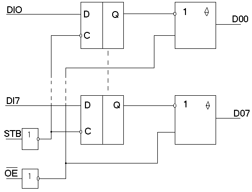 (б) 3.2.Организация работы микросхемы К555КП2. Мультиплексор К555КП2- это два мультиплексора 14 с общим дешефратором адреса канала и входами выбора (стробирующими входами) одного из мультиплексоров Е.0 и E.1. Инверторы на входах Е.0 и Е.1 предназначены для развязки внутренних цепей от входных шин и обеспечивают помехоустойчивость схемы по входу. Запрещена передача информации через мультиплексор, когда он находится в невыбранном состоянии (при этом выход находится в состоянии низкого уровня). Каждый из мультиплексоров имеет по четыре информационных входа и свои стробирующие входы Е.0 и Е1. Два аресных входа SED1 и SED2 управляют одновременно двумя мультиплексорами. Код, который набран на адресных входах SED1 и SED2, разрешает работу только одного из информационных входов каждого мультиплексора. Сигнал с выбранного информационного входа появляется на выходе только при наличии на стробирующем входе Е низкого уровня. Первая ступень мультиплексора выполнена на инверторах, вторая на логических элементах И-ИЛИ (без инверсии), использует стробирующие свойства функции И аргументов канала информации и адреса. ИС К555КП2 включает входы управления с передачи при низком уровне напряжения на входе и с запретом передачи при высоком уровне напряжения на входе. 3.3.Характеристики микросхемы К555КП2 IВХ низкого уровня -0.4мА IВХ высокого уровня 0.04мА IВЫХ низкого уровня 4мА IВЫХ высокого уровня -0.4 мА UВХ МАХ 5.5В UВХ MIN –0.4B UВХ низкого уровня 0.4В UВХ высокого уровня 2.5В Нагрузочная способность 10 Время задержки распространения сигнала: при включении 20нс (СН=15пФ) при выключении 20нс (СН=15Пф) Средний ток потребления не более 3мА Помехоустойчивость 0.3B Частота переключения не более 25МГц UМАХ питания 5.5B СН МАХ=150пФ Диапазон рабочих температур -10 +70°С 4.1.Принцип работы микросхемы КР580ИР82. КР580ИР82 представляет собой 8-разрядный буферный регистр, предназначенный для ввода и вывода информации со стробированием. Микросхема имеет восемь триггеров D-типа и восемь выходных буферов, имеющих на выходе состояние “выключено”. Управление передачей информации осуществляется с помощью сигнала STB “строб”. При поступлении на вход STB сигнала высокого уровня осуществляется нетактируемая передача информации от входа DI до выхода DO. При подаче на вход STB сигнала низкого уровня микросхема хранит информацию предыдущего такта; при подаче на вход STB положительного перепада импульса происходит “защелкивание” входной информации. Выходные буферы управляются сигналом ОЕ “разрешение выхода”. При поступлении на вход ОЕ сигнала высокого уровня выходные буферы переводятся в состояние “выключено”. Функциональная схема микросхемы КР580ИР82.