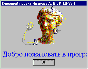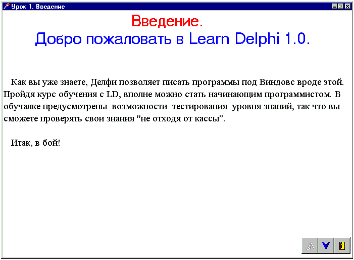 Рисунок 1. 1 – Окно, возникающее после запуска По нему «ползет» надпись: «Добро пожаловать в программу Learn Delphi!!!». Для входа в программу надо нажать кнопку «ОК». Следующее окно показано на рис. 1. 2: