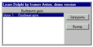 Рисунок 1. 2 – Окно выбора нужного урока Пользователь выбирает нужный ему урок и нажимает кнопку «Загрузить». После этого он видит основное окно, в которое загружена первая страница урока. Это окно представлено на рис. 1. 3 (стр. 8). В правом нижнем углу окна помещены три кнопки SpeedButton: