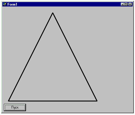 Ниже приведены примеры программ, использующих типизированные константы. Они написаны в Delphi, но в виде консольного приложения – чтобы не загромождать текст программ описанием форм и других объектов, к которым данная задача не имеет отношения. Тексты программ-примеров помещены на дискете с курсовой работой в директории EXAMPLES. Пример 1. program Example1; {$APPTYPE CONSOLE} {Данная программа-пример демонстрирует применение констант-массивов. Преобразует численный формат даты в обычный, с названием месяца} uses SysUtils; const month:array[1..12] of string[20]=('January','February','March','April','May', 'June','July','August','September','October','November', 'December'); var d:string[10]; s:string[30]; s1:string[3]; begin write('Enter date (dd:mm:yyyy): '); readln(d); s:=''; if copy(d,1,1)<>'1' then begin if copy(d,2,1)='1' then s1:='`st' else if copy(d,2,1)='2' then s1:='`nd' else if copy(d,2,1)='3' then s1:='`rd' end else s1:='`th'; s:=copy(d,1,2)+s1+' of '+month[strtoint(copy(d,4,2))]+' ' +copy(d,7,4); writeln(s); readln end. Пример 2. unit Example2frm; {Этот пример показывает,как применяются константы-записи. Здесь строится многоугольник (с применением метода Polyline объекта Canvas),а координаты вершин многоугольника содержатся в массиве констант-записей.} interface uses Windows, Messages, SysUtils, Classes, Graphics, Controls, Forms, Dialogs, StdCtrls; type TForm1 = class(TForm) Button1: TButton; procedure Button1Click(Sender: TObject); private { Private declarations } public { Public declarations } end; var Form1: TForm1; PolyLines:array[1..4] of tpoint=((x:170;y:20),(x:320;y:320),(x:20;y:320), (x:170;y:20)); implementation {$R *.DFM} procedure TForm1.Button1Click(Sender: TObject); begin form1.Canvas.Pen.Width:=3; form1.canvas.Polyline(polylines) end; end. Окно этой программы-примера приведено на рис. 2. 1 (стр. 20):