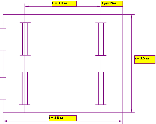 Оптимальный уровень яркости, отображаемой на экране дисплея информации, должен лежать в пределах от десятка до сотен Кд/м2. Размер объекта различения не менее 0.6 мм (тип монитора - VGA). Контрастность изображения (объект/фон) не менее 0.8. Низкочастотное дрожание изображения на экране монитора должно находиться в пределах 0.1 мм. ( требования к вычислительной технике по СН 4559-88). Время непрерывной работы с экраном в большинстве случаев не должно превышать 1.5 — 2 часа, длительность перерывов для отдыха должна составлять 5 — 15 мин. Расчет общего искусственного освещения помещения. Выбор источников освещения. Для освещения помещения искусственным светом из всех существующих источников света, наиболее целесообразно использовать люминесцентные лампы (лампы дневного света), так как они экономичны, и их спектр близок к дневному свету. Расположение источников света. Общее освещение реализуется с помощью простых и распространенных светильников таких, как открытые двухламповые светильники УСП35. Они используются для освещения нормальных помещений с отражением потолка и стен, а также при умеренной влажности и запыленности. При выборе расположения светильников необходимо руководствоваться двумя критериями: 1) обеспечение высокого качества освещения, ограничения ослепляемости и необходимой направленности света на рабочее место; 2) наиболее экономичное создание нормированной освещенности. Характеристики помещения: · высота помещения H = 3.0 м; · длина помещения l = 4.8 м; · ширина помещения a = 3.5 м. Для рабочего стола пользователя уровень рабочей поверхности над полом составляет 0.7 м. Тогда: h = H - 0.7 = 2.3 м. У светильников УСП35 коэффициент запаса kз = 1.3 . Отсюда расстояние между светильниками L: L = kз * h = 1.3 * 2.3 = 2.99 м » 3.0 м. Располагаем светильники вдоль стороны помещения с окном. Расстояние между стенами и крайним рядом светильников считаем по формуле: Lст = 0.3 * L = 0.3 * 3.0 = 0.897 м » 0.9 м. Для равномерного общего освещения светильники располагаются рядами, параллельными стенам с окнами. Количество светильников в одном ряду равно 2. Расчет светового потока. Расчет требуемого светового потока F производится по формуле: F = En * S * z * kз / (n * N), где: Eн — нормированная минимальная освещенность, лк; S — площадь освещаемого помещения; z — коэффициент минимальной освещенности, равный отношению средней освещенности к минимальной. При использовании люминесцентных ламп z = 1.1; kз — коэффициент запаса, учитывающий запыление светильников и износ источников света. Для помещений ВЦ, освещенных люминесцентными лампами, kз = 1.4. N — число светильников; n — коэффициент использования светового потока, который показывает, какая часть от общего светового потока приходится на рассчитываемую плоскость. Он зависит от типа светильников, коэффициентов отражения светового потока от стен Qс, потолка Qп, пола Qпола, геометрических размеров помещения и высоты подвеса светильников, что учитывается индексом помещения i: i = S / ( h * ( l + a ) ) = 17.5 / ( 2.3 * ( 4.8 + 3.5 ) ) = 0.92. С учетом отражения стен и потолка выбираем n = 0.5. Итак, Ен = 300 лк; S = 16.8 м2; kз = 1.4; z = 1.1; N = 4; n = 0.5. Тогда, F = 300 * 16.8 * 1.4 * 1.1 / (0.5 * 4) = 3881 лм. Учитывая, что расчёт производится для двухлампового светильника, выбираем лампы ЛБ 30, которые имеют: световой поток Ел = 2100 лм, потребляемая мощность Pпот = 30 Вт. Рассчитаем общую потребляемую мощность системы освещения и ми