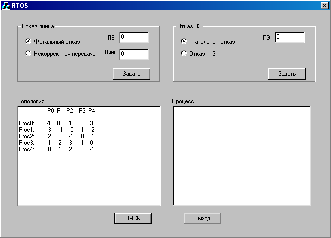 Рис 2.5. Топология ВС Физическая связь (линк) под номером 4 используется каждым ПЭ для обмена с объектом управления и приема данных функциональной задачей для расчета на очередном цикле. В данной главе аспекты использования и надежности этих связей не рассматриваются, анализу подвергается только внутренняя структура ВС.2.5.1. Инициализация Для инициализации работы процессорных элементов используются конфигурационные файлы, содержащие номер ПЭ и таблицу связности (таблица 2.8). Таблица 2.8