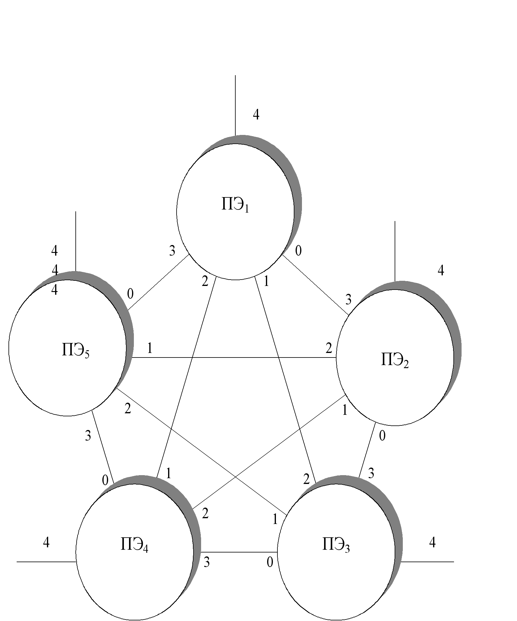 Рассмотрим процесс принятия решения ПЭ1: Вариант 1: «Мусор» от ПЭ3 и данные ПЭ2 говорят о неисправности ПЭ2 или линка 2-1. Диагноз ПЭ5 подтверждает неисправность ПЭ2. Таким образом каждая запись в ПЭ1 прямо или косвенно говорит о неисправности ПЭ2 или его связей. В силу ординарности потока отказов принимается решение об отказе ПЭ2. Вариант 2: Один противоречивый результат маскируется тремя подтверждениями неисправности ПЭ2, так как одновременный отказ всех линков трактутся также как и отказ всего ПЭ2. Аналогично в ПЭ3 и ПЭ5 в любом случае оказывается минимум два сообщения об отказе ПЭ2 или его связей. Как было отмечено выше вероятность отказа одновременно нескольких каналов связи существенно меньше вероятности отказа ПЭ, и вследствие предположения об ординарности потока отказов, делается вывод об отказе ПЭ2. Рассмотрим деградацию системы после отказа линка 2-3. Топология системы представлена на рис. 2.7.
