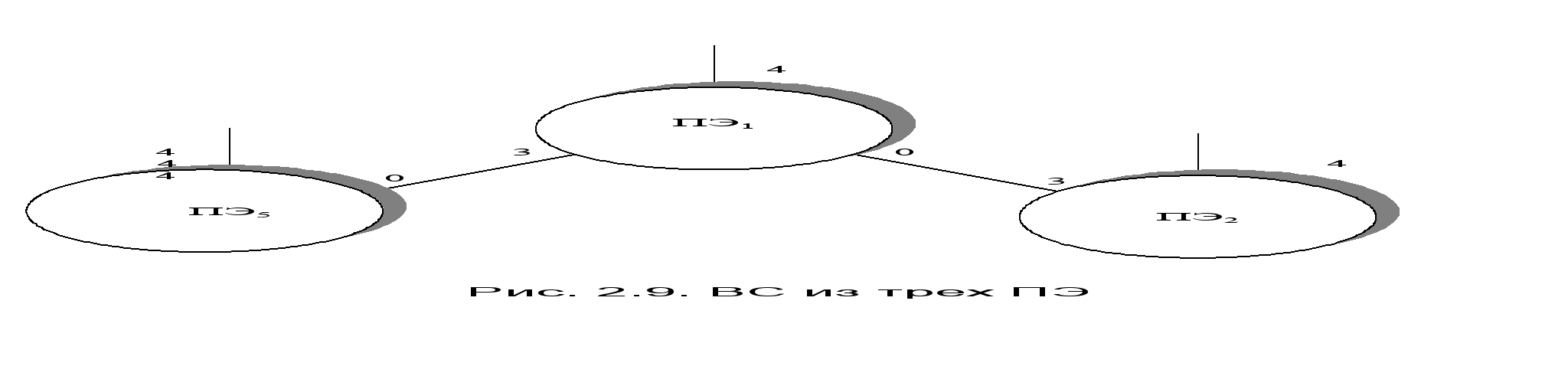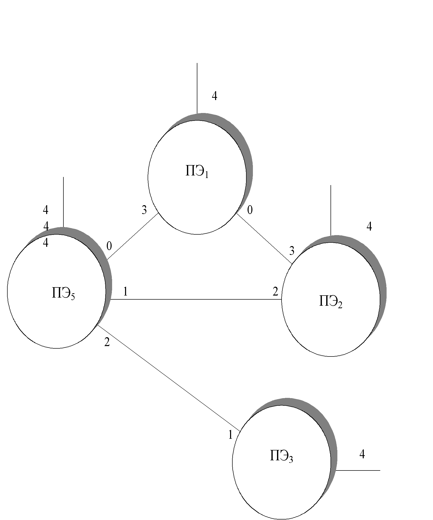 Вариант 1: Сообщение от ПЭ4, содержит «мусор», что говорит о неисправности ПЭ4 или его каналов связи. Однако ПЭ1 и ПЭ5 приняли решение о неисправности ПЭ4 или каналов связи 5-4, 4-1. Поскольку отказ сразу всех каналов связи ПЭ4 и отказ ПЭ4 события равнозначные, принимается решение об неисправности ПЭ4. Вариант 2: Сообщение ПЭ4 подтверждает результаты голосования в тройке ПЭ4, ПЭ5, ПЭ1 и принимается решение об отказе ПЭ4. После двух отказов (линка 3-1 и ПЭ4) ВС имеет вид (рис. 2.6)