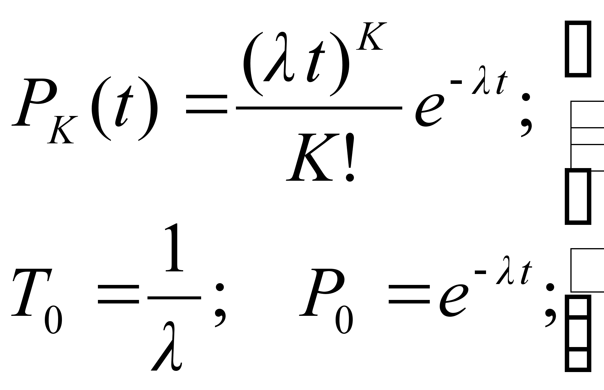 l - параметр потока, интенсивность потока отказов; T0 – математическое ожидание длины интервала между соседними событиями – среднее время наработки на отказ; P0(t) – вероятность того, что за время t не произойдет ни одного события (отказа), вероятность безотказной работы.