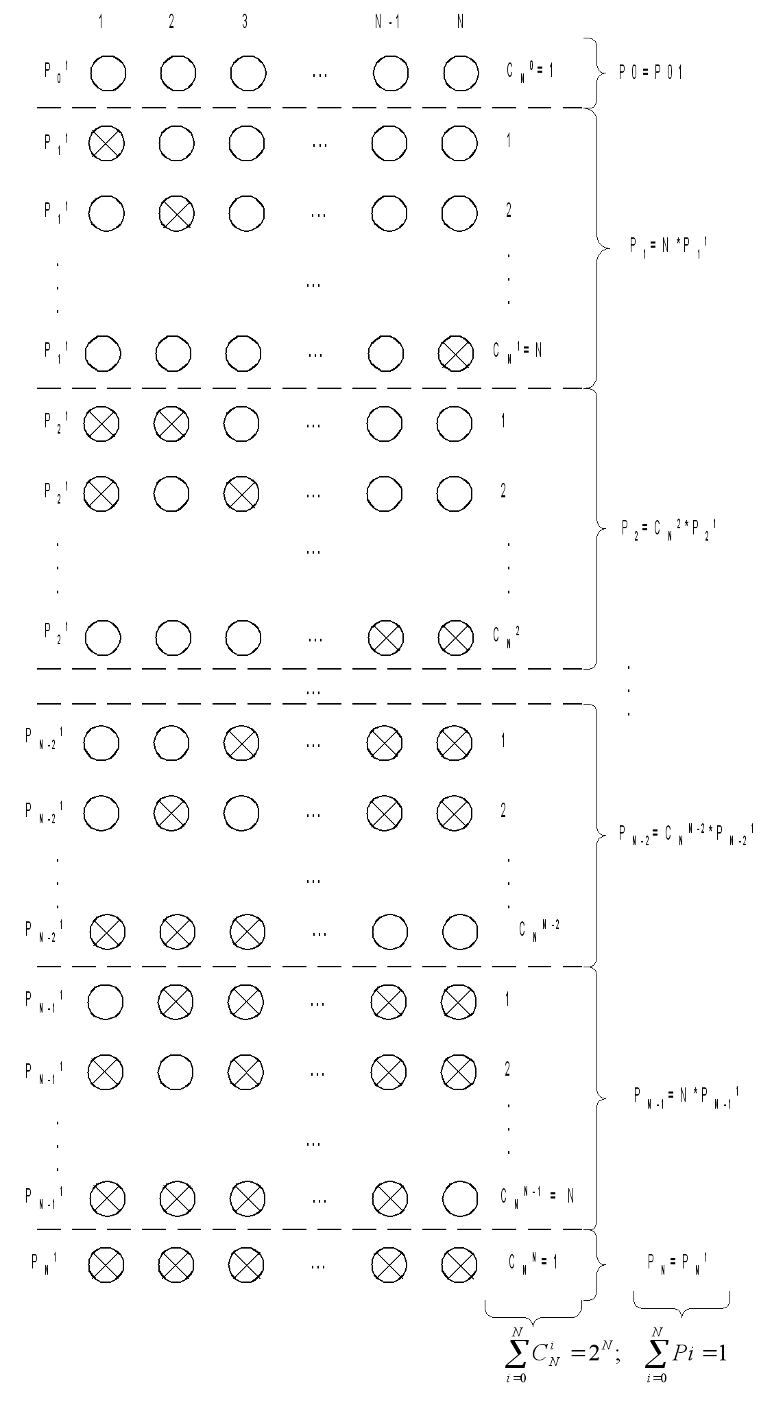 ( Т.к. в произвольный момент времени система может находится только в одном из всех 2N состояний, то эти события являются несовместными. Поэтому вероятность нахождения системы в любом из состояний, относящихся к одной из упомянутых выше групп можно получить как сумму вероятностей нахождения системы во всех состояниях данной группы. А если учесть, что внутри каждой i-й группы все состояния характеризуются наличием ровно i отказавших узлов, то вероятности для всех состояний одной группы равны между собой, поэтому: