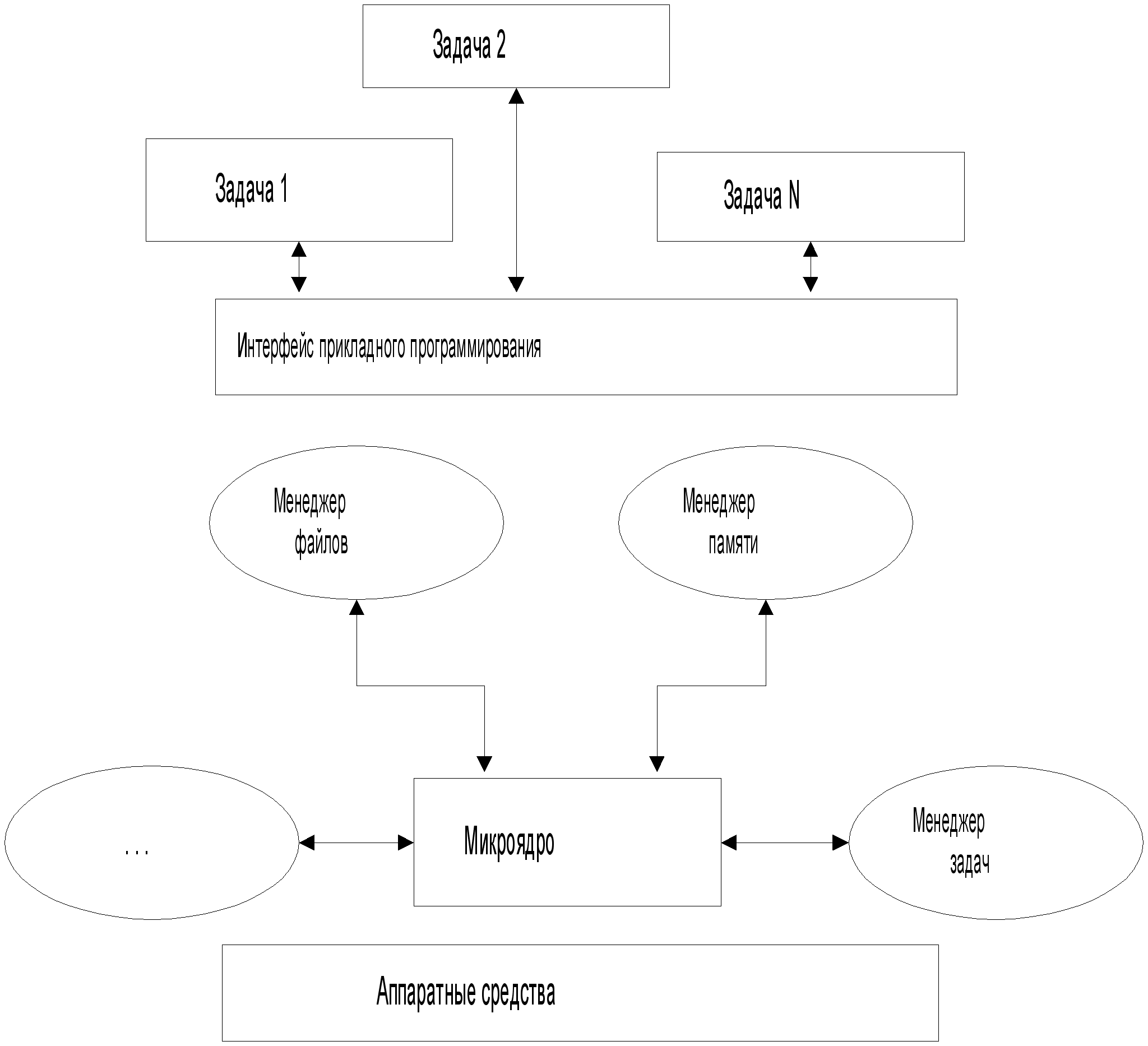 Рис. 1.1. ОСРВ с монолитной архитектурой Интерфейс в таких системах играет двойную роль: 1. управление взаимодействием прикладных процессов и системы, 2. обеспечение непрерывности выполнения кода системы (т.е. отсутствие переключения задач во время исполнения кода системы). Основным преимуществом монолитной архитектуры является ее относительная быстрота работы по сравнению с другими архитектурами. Однако, достигается это, в основном, за счет написания значительных частей системы на ассемблере. Недостатки монолитной архитектуры. 1. Системные вызовы, требующие переключения уровней привилегий (от пользовательской задачи к ядру), должны быть реализованы как прерывания или специальный тип исключений. Это сильно увеличивает время их работы. 2. Ядро не может быть прервано пользовательской задачей (non-preemptable). Это может приводить к тому, что высокоприоритетная задача может не получить управления из-за работы низкоприоритетной. 3. Сложность переноса на новые архитектуры процессора из-за значительных ассемблерных вставок. 4. Негибкость и сложность развития: изменение части ядра системы требует его полной перекомпиляции. Модульная архитектура (на основе микроядра) Модульная архитектура появилась, как попытка убрать интерфейс между приложениями и ядром и облегчить модернизацию системы и перенос ее на новые процессоры. Теперь микроядро играет двойную роль(рис 1.2): 1. управление взаимодействием частей системы (например, менеджеров процессов и файлов),