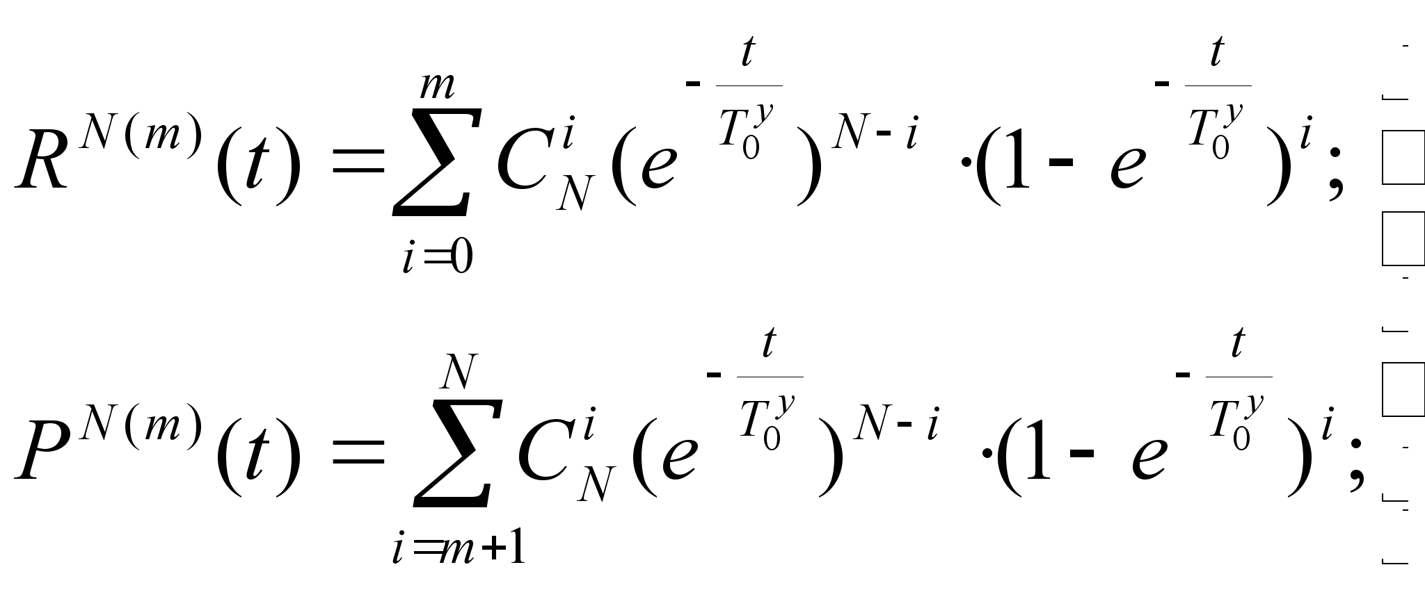 Критерием правильности предложенной методики является выполнение условия R(t)+P(t)=1 для любых систем и любых значений t. Объединяя выражения (2) (3) (4) и (5), получим окончательные формулы для вычисления вероятностей безотказной работы – RN(m)(t) и фатального отказа –PN(m)(t) систем ОС-N(m) для произвольного момента времени t: