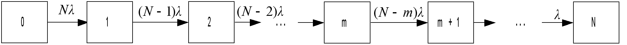 Рассмотрим теперь определение среднего времени наработки на отказ T0N(m) отказоустойчивых систем ОС-N(m). Невосстанавливаемая N-узловая отказоустойчивая система m-го ранга (ОС-N(m)) может быть представлена марковской моделью с количеством состояний (N+1):