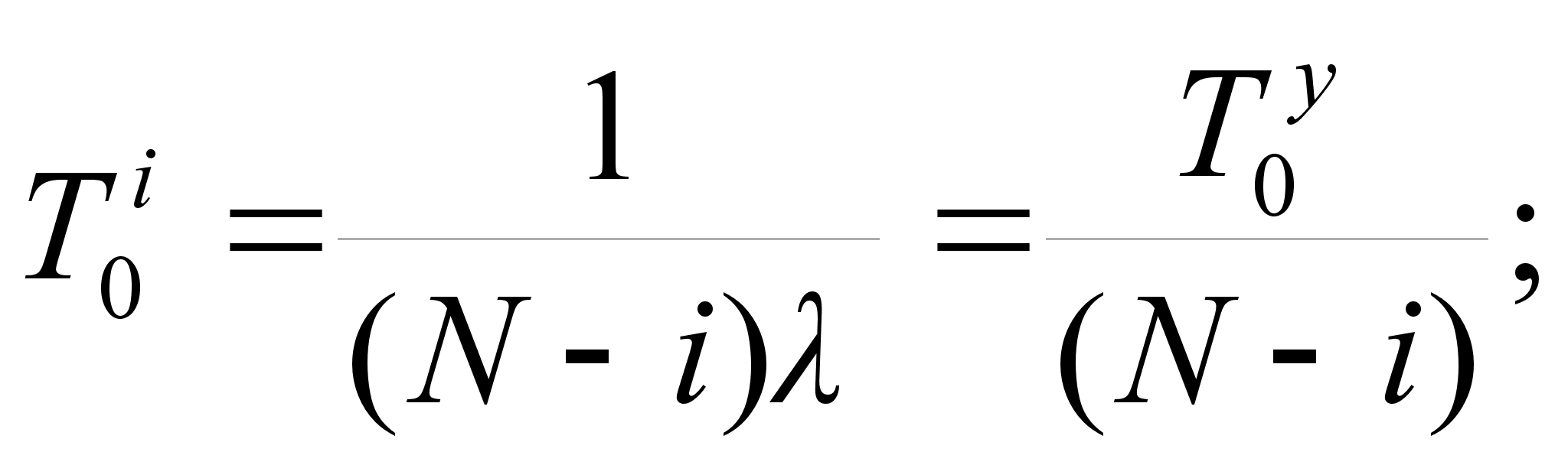 Переход из одного состояния в другое (по мере постепенной деградации системы) определяется интенсивностью потока отказов, воздействующих на систему, находящуюся в соответствующем состоянии. Интенсивность потока отказов, воздействующих на систему, находящуюся в i-м состоянии, определяется количеством работоспособных узлов (N-i). Т.о. среднее время нахождения системы в i-м состоянии определяется следующим образом: