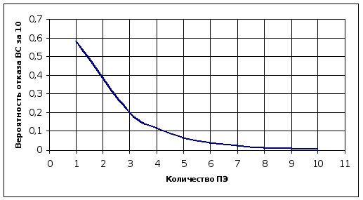 Рис 2.11. Вероятность отказа ВС типа N(N-1) за 10 лет. Анализ кривых показывает, что среднее время безотказной работы увеличивается в 2-3 раза по сравнению со средним временем безотказной работы одного ПЭ при наращивании вычислительных ресурсов в 5-7 раз и далее стабилизируется и возрастает незначительно. Вероятность отказа систем с рангом отказоустойчивости N(N-1) резко уменьшается при рассмотрении ВС типа 5(4) – 7(6) и далее ее снижение незначительно. Таким образом, при построении отказоустойчивых вычислительных систем рекомендуется выбирать системы с характеристиками 5(4) – 7(6), с учетом ограничения массы, энергопотребления и др. характеристик. 2.7. Выводы к главе 2Подводя итог, стоит еще раз отметить, что надежность ВС в процессе эксплуатации складывается из надежности аппаратной и программной компонент системы. В связи с этим были рассмотрены виды и причины отказов при работе ВС, причем особое внимание уделялось возникновению ошибок вследствие неисправностей аппаратных компонент системы, так как ошибки программного обеспечения означают, что они не были выявлены на этапе тестирования. Для обеспечения надежного решения задач в условиях отказов применяются два подхода – восстановление и предотвращение отказа системы (отказоустойчивость). При создании специализированной ОСРВ, предпочтение отдано второму подходу, поскольку восстановление в ряде случаев может быть связано со значительными затратами процессорного времени и (или) прерыванием вычислительного процесса. В связи с этим рассмотрены механизмы обеспечения отказоустойчивости, основными из которых являются протоколы голосования и принятия коллективного решения. Введено понятие ранга отказоустойчивости, описана структура ОСРВ и концепция работы системы с рангом отказоустойчивости N(N-1). Дано описание системных таблиц, структуры и взаимодействия модулей ОСРВ таких как маршрутиатор, реконфигуратор, модуль коммункации, голосования и анализа отказов. Рассмотрен пример организации отказоустойчивых вычислений на примере пятиузловой полносвязной ВС в условиях постоянной деградации, приведена логика анализа отказа в условиях ординарного потока отказов. В заключении произведена оценка надежностных характеристик ВС с рангом отказоустйчивости N(N-1) и рассчитаны характеристики систем 1(0) – 10(9). Анализ характеристик выявил значительне увеличение времени безотказной работы системы с увеличением числа ПЭ и уменьшение вероятности отказа всей системы. Например, вроятность отказа системы 5(4) за 10 лет с временем безотказной работы одного ПЭ 10000 часов составила 0,068, что меньше вероятности отказа одного ПЭ за тот же период в 8,5 раз. Исходя из этих результатов были сделаны рекомендации по выбору типа ВС при ее проектировании. 3. Программное обеспечение модели отказоустойчивой ВС Основными задачами при разработке программной модели отказоустойчивой ВС, функционирующей под управлением распределенной ОСРВ, стали следующие: