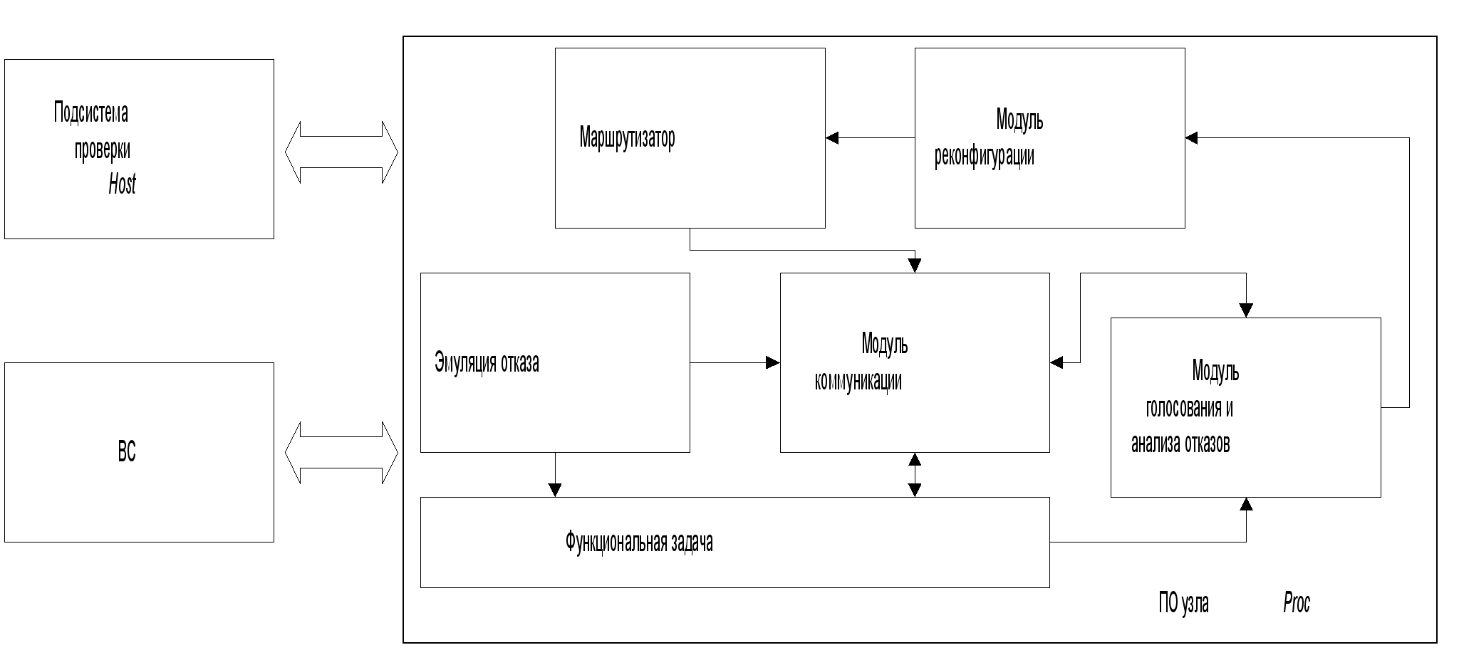 В ходе дальнейших исследований, был рассмотрен пример организации отказоустойчивых вычислений, и на основе логики принятия консолидированного решения, предложен эвристический алгоритм анализа результатов голосования узлов (ПЭ) ВС и средств диагностики. Далее была предложена вероятностная модель отказоустойчивой ВС, рассчитаны ее надежностные характеристики, показавшие увеличение среднего времени наработки ВС на отказ в 2,5 – 3,5 раз с расширением ВС до 5-7 узлов, даны рекомендации по выбору типа ВС при ее проектировании. В ходе практической реализации свойств отказоустойчивости, была создана программная модель, имитирующая многопроцессорную ВС, управляемую распределенной ОСРВ. Структура ПО модели включает в себя ПО узла ВС и ПО системы контроля и диалога с пользователем. Модель позволила отработать логику организации отказоустойчивых вычислений и проверить ее в различных ситуациях. Реализация модели позволила выделить ключевые особенности системного ПО, характерного для организации отказоустойчивых вычислений в целом: