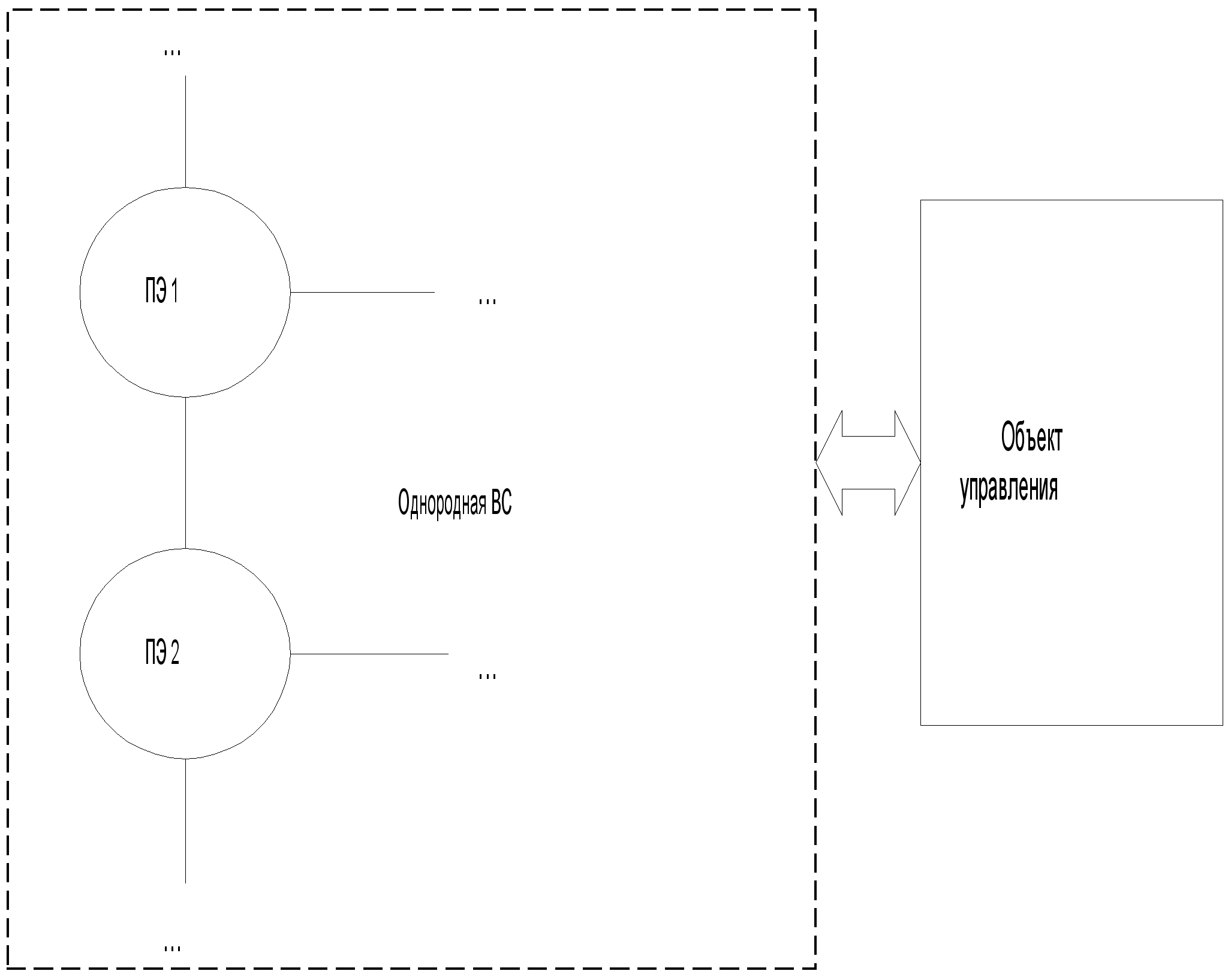 Даны рекомендации по портированию системного ПО на платфртму TMS320C30. Выбор платформы осуществлялся по таким критериям, как: наличие широкого спектра совместимых базовых ОСРВ, оптимизация микропроцессора под задачи управления, тактовая частота микропроцессора, объем оперативной памяти, наличие сред разработки и отладки и т.д. Реализованы аппаратно-зависимые модули ПО в части процедур самодиагностики процессора и памяти. В заключение, перечислены основные перспективы наращивания возможностей системного ПО и усложнения принципов его работы. Дальнейшее развитие реализованных в представленной работе принципов в еще более сложные системы позволит решать еще более широкий круг задач в рамках обеспечения надежности вычислительных систем. Технологическая часть 6.Технологическая часть Данная глава посвящена технологии разработки программного обепечения модели отказоустойчивой распределенной вычислительной системы и переносу (портированию) основных модулей отказоустойчивой ОСРВ на платформу TMS320C30. Программное обеспечение модели ВС состоит из двух частей, разработанных для функционирования на базе персонального компьютера с процессором Pentium-100 и выше с операционной системой Windows 98 и выше. Первая часть предназначена для генерации системных файлов процессорных элементов ВС на основе заданной топологии, запуска модели ВС, имитации объекта управления и генерации системной информации о сбоях ВС. Вторая часть предназначена для моделирования узла ВС. Программное обеспечение, переносимое на платформу TMS320C30, на данном этапе состоит из набора функций, которые являются надстройкой над базовой ОСРВ. 6.1. Системные исследования В ходе системных исследований проводился анализ системы, в которой будет использоваться разрабатываемая ОСРВ, и были выделены основные надстройки над базовой ОСРВ для поддержания свойств системы в процессе ее работы. Общая структура системы, моделируемая разрабатываемым программным продуктом, представлена на рис. 6.1. Таким образом, программное обеспечение модели системы разбивается на две части. Первая – это ПО, в задачи которой входит: моделирование объекта управления (обмен информацией с ВС), инициализация ВС на основе заданной топологической информации, моделирование сбоев и отказов элементов ВС для отладки модулей обеспечения отказоустойчивости ВС.
